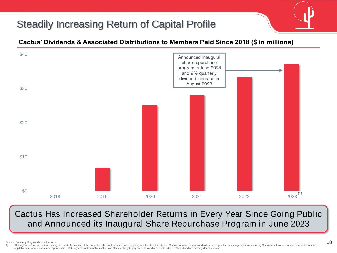17 171% (39%) WHD OSX Share Price Performance of Cactus vs. the OSX since IPO Note: Data based on share price performance from 2/7/2018 to 5/7/2024. Cactus 2/7/2018 price set as IPO price of $19 per share. Source: Factset Share Price Outperformed the OSX in 4 of 6 years since IPO Execution Has Driven Equity Outperformance 0%