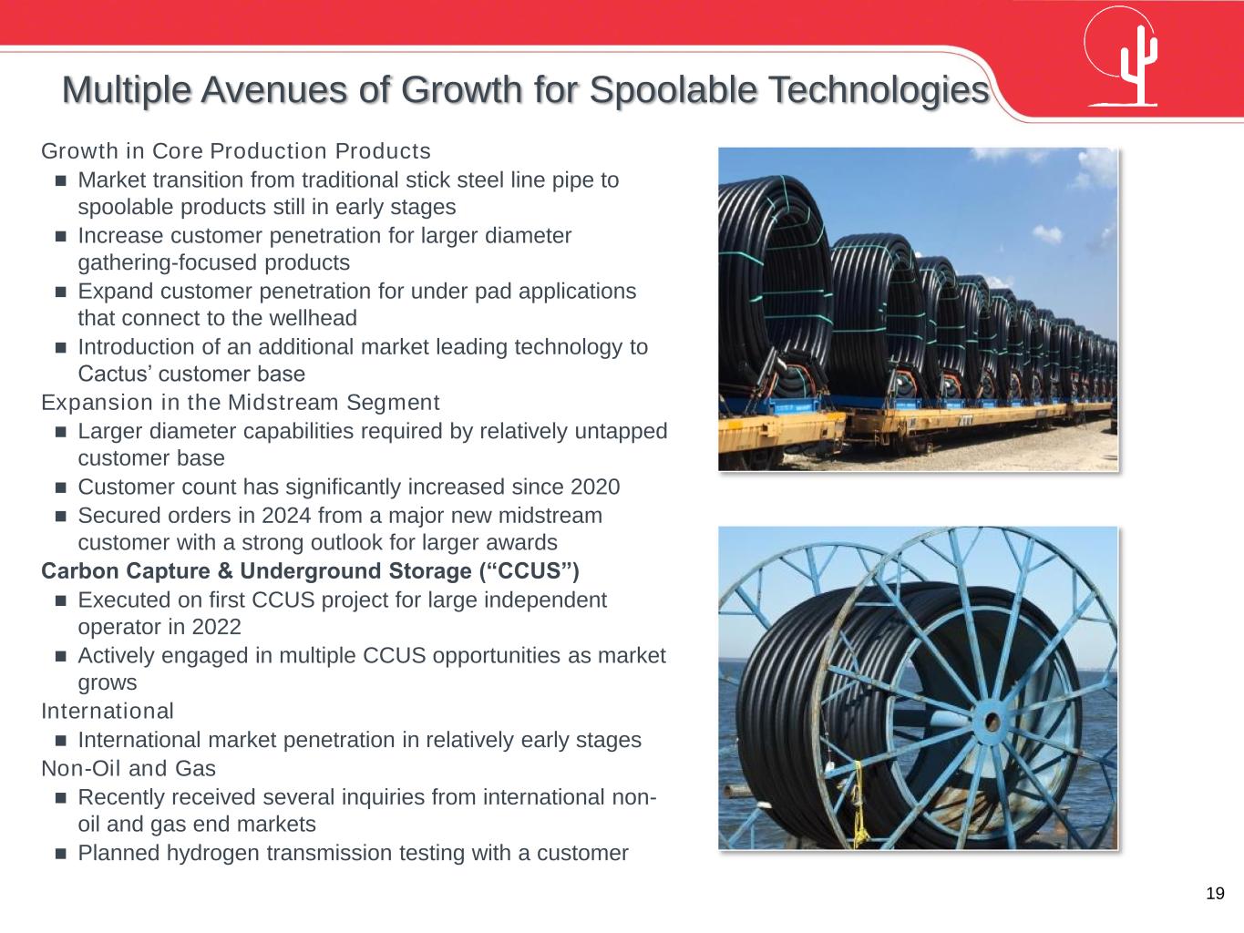 18 $0 $10 $20 $30 $40 2018 2019 2020 2021 2022 2023 Cactus’ Dividends & Associated Distributions to Members Paid Since 2018 ($ in millions) Source: Company filings and annual reports. 1) Although we intend to continue paying the quarterly dividend at the current levels, Cactus' future dividend policy is within the discretion of Cactus' board of directors and will depend upon then-existing conditions, including Cactus' results of operations, financial condition, capital requirements, investment opportunities, statutory and contractual restrictions on Cactus' ability to pay dividends and other factors Cactus' board of directors may deem relevant. Cactus Has Increased Shareholder Returns in Every Year Since Going Public and Announced its Inaugural Share Repurchase Program in June 2023 Steadily Increasing Return of Capital Profile (1) Announced inaugural share repurchase program in June 2023 and 9% quarterly dividend increase in August 2023