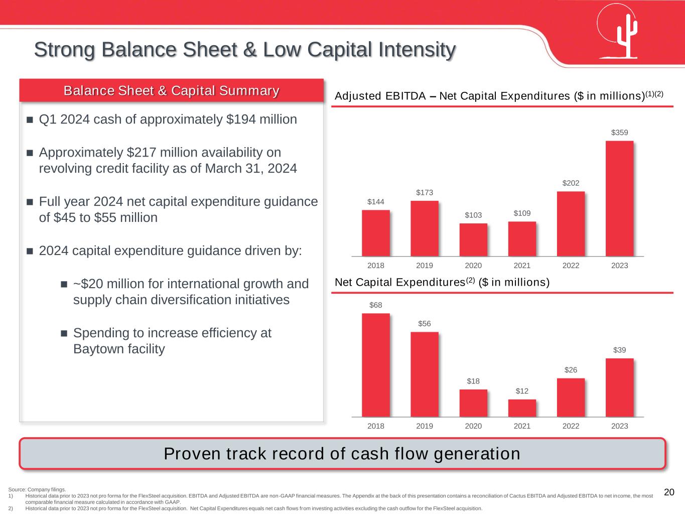 20 ◼ Q1 2024 cash of approximately $194 million ◼ Approximately $217 million availability on revolving credit facility as of March 31, 2024 ◼ Full year 2024 net capital expenditure guidance of $45 to $55 million ◼ 2024 capital expenditure guidance driven by: ◼ ~$20 million for international growth and supply chain diversification initiatives ◼ Spending to increase efficiency at Baytown facility Adjusted EBITDA – Net Capital Expenditures ($ in millions)(1)(2) Proven track record of cash flow generation Net Capital Expenditures(2) ($ in millions) Balance Sheet & Capital Summary Source: Company filings. 1) Historical data prior to 2023 not pro forma for the FlexSteel acquisition. EBITDA and Adjusted EBITDA are non-GAAP financial measures. The Appendix at the back of this presentation contains a reconciliation of Cactus EBITDA and Adjusted EBITDA to net income, the most comparable financial measure calculated in accordance with GAAP. 2) Historical data prior to 2023 not pro forma for the FlexSteel acquisition. Net Capital Expenditures equals net cash flows from investing activities excluding the cash outflow for the FlexSteel acquisition. Strong Balance Sheet & Low Capital Intensity $144 $173 $103 $109 $202 $359 2018 2019 2020 2021 2022 2023 $68 $56 $18 $12 $26 $39 2018 2019 2020 2021 2022 2023