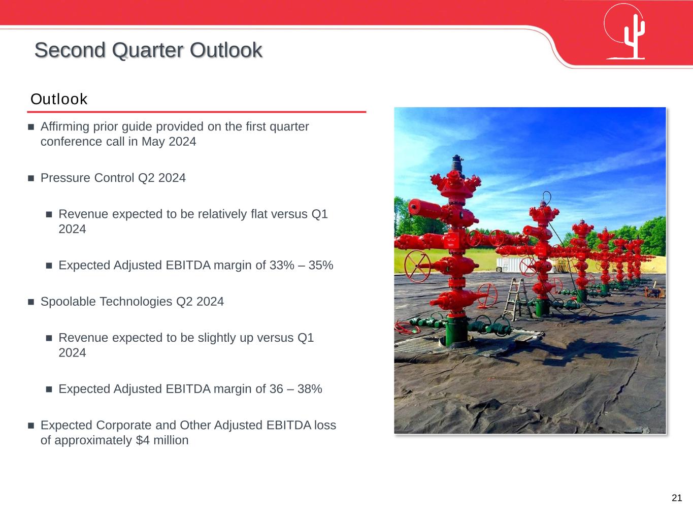 21 ◼ Affirming prior guide provided on the first quarter conference call in May 2024 ◼ Pressure Control Q2 2024 ◼ Revenue expected to be relatively flat versus Q1 2024 ◼ Expected Adjusted EBITDA margin of 33% – 35% ◼ Spoolable Technologies Q2 2024 ◼ Revenue expected to be slightly up versus Q1 2024 ◼ Expected Adjusted EBITDA margin of 36 – 38% ◼ Expected Corporate and Other Adjusted EBITDA loss of approximately $4 million Second Quarter Outlook Outlook