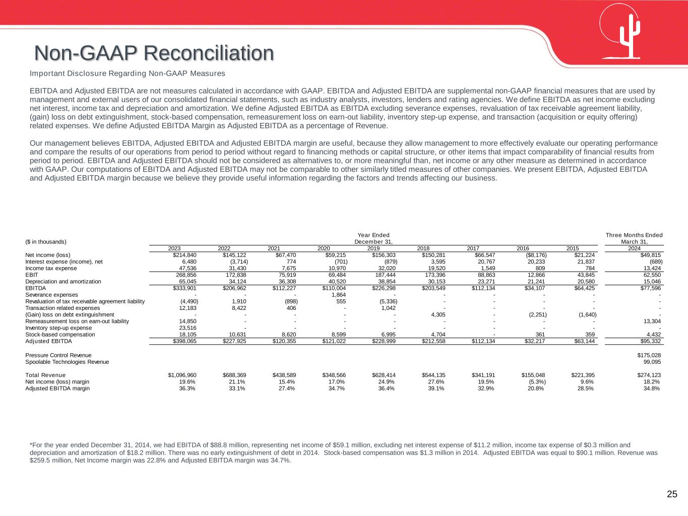 25 Year Ended Three Months Ended ($ in thousands) December 31, March 31, 2023 2022 2021 2020 2019 2018 2017 2016 2015 2024 Net income (loss) $214,840 $145,122 $67,470 $59,215 $156,303 $150,281 $66,547 ($8,176) $21,224 $49,815 Interest expense (income), net 6,480 (3,714) 774 (701) (879) 3,595 20,767 20,233 21,837 (689) Income tax expense 47,536 31,430 7,675 10,970 32,020 19,520 1,549 809 784 13,424 EBIT 268,856 172,838 75,919 69,484 187,444 173,396 88,863 12,866 43,845 62,550 Depreciation and amortization 65,045 34,124 36,308 40,520 38,854 30,153 23,271 21,241 20,580 15,046 EBITDA $333,901 $206,962 $112,227 $110,004 $226,298 $203,549 $112,134 $34,107 $64,425 $77,596 Severance expenses - - - 1,864 - - - - - - Revaluation of tax receivable agreement liability (4,490) 1,910 (898) 555 (5,336) - - - - - Transaction related expenses 12,183 8,422 406 - 1,042 - - - - - (Gain) loss on debt extinguishment - - - - - 4,305 - (2,251) (1,640) - Remeasurement loss on earn-out liability 14,850 - - - - - - - - 13,304 Inventory step-up expense 23,516 - - - - - - - - - Stock-based compensation 18,105 10,631 8,620 8,599 6,995 4,704 - 361 359 4,432 Adjusted EBITDA $398,065 $227,925 $120,355 $121,022 $228,999 $212,558 $112,134 $32,217 $63,144 $95,332 Pressure Control Revenue $175,028 Spoolable Technologies Revenue 99,095 Total Revenue $1,096,960 $688,369 $438,589 $348,566 $628,414 $544,135 $341,191 $155,048 $221,395 $274,123 Net income (loss) margin 19.6% 21.1% 15.4% 17.0% 24.9% 27.6% 19.5% (5.3%) 9.6% 18.2% Adjusted EBITDA margin 36.3% 33.1% 27.4% 34.7% 36.4% 39.1% 32.9% 20.8% 28.5% 34.8% Non-GAAP Reconciliation Important Disclosure Regarding Non-GAAP Measures EBITDA and Adjusted EBITDA are not measures calculated in accordance with GAAP. EBITDA and Adjusted EBITDA are supplemental non-GAAP financial measures that are used by management and external users of our consolidated financial statements, such as industry analysts, investors, lenders and rating agencies. We define EBITDA as net income excluding net interest, income tax and depreciation and amortization. We define Adjusted EBITDA as EBITDA excluding severance expenses, revaluation of tax receivable agreement liability, (gain) loss on debt extinguishment, stock-based compensation, remeasurement loss on earn-out liability, inventory step-up expense, and transaction (acquisition or equity offering) related expenses. We define Adjusted EBITDA Margin as Adjusted EBITDA as a percentage of Revenue. Our management believes EBITDA, Adjusted EBITDA and Adjusted EBITDA margin are useful, because they allow management to more effectively evaluate our operating performance and compare the results of our operations from period to period without regard to financing methods or capital structure, or other items that impact comparability of financial results from period to period. EBITDA and Adjusted EBITDA should not be considered as alternatives to, or more meaningful than, net income or any other measure as determined in accordance with GAAP. Our computations of EBITDA and Adjusted EBITDA may not be comparable to other similarly titled measures of other companies. We present EBITDA, Adjusted EBITDA and Adjusted EBITDA margin because we believe they provide useful information regarding the factors and trends affecting our business. *For the year ended December 31, 2014, we had EBITDA of $88.8 million, representing net income of $59.1 million, excluding net interest expense of $11.2 million, income tax expense of $0.3 million and depreciation and amortization of $18.2 million. There was no early extinguishment of debt in 2014. Stock-based compensation was $1.3 million in 2014. Adjusted EBITDA was equal to $90.1 million. Revenue was $259.5 million, Net Income margin was 22.8% and Adjusted EBITDA margin was 34.7%.