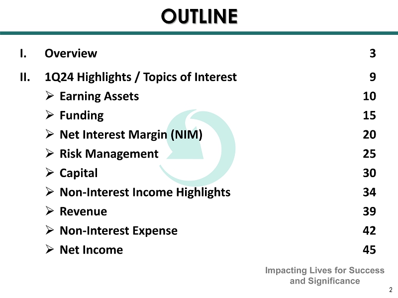 OUTLINE 2 I. Overview 3 II. 1Q24 Highlights / Topics of Interest 9 » Earning Assets 10 » Funding 15 » Net Interest Margin (NIM) 20 » Risk Management 25 » Capital 30 » Non - Interest Income Highlights 34 » Revenue 39 » Non - Interest Expense 42 » Net Income 45 Impacting Lives for Success and Significance