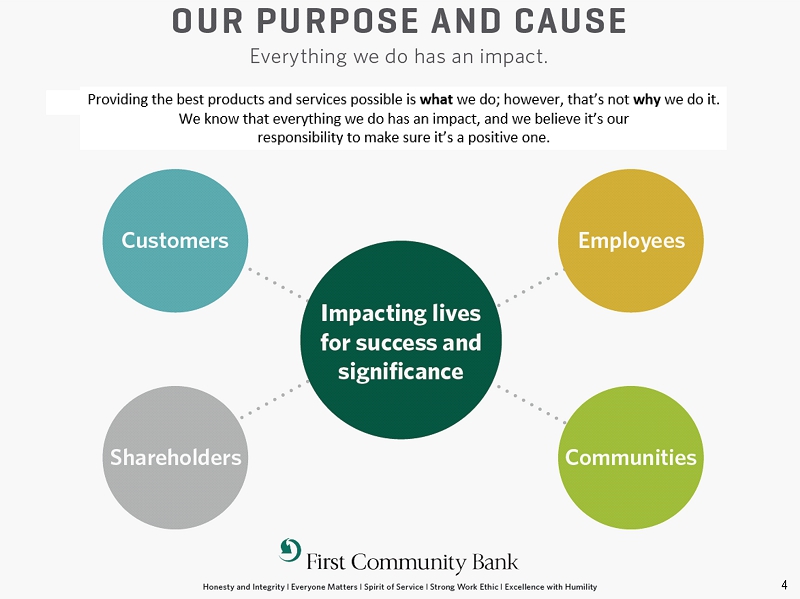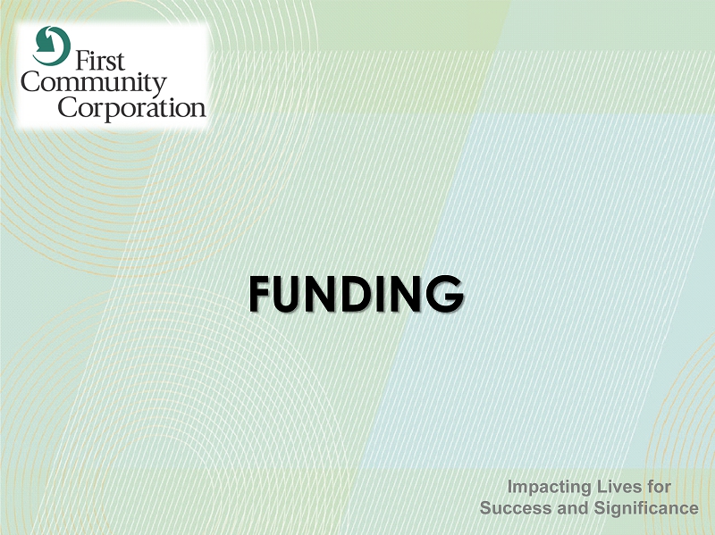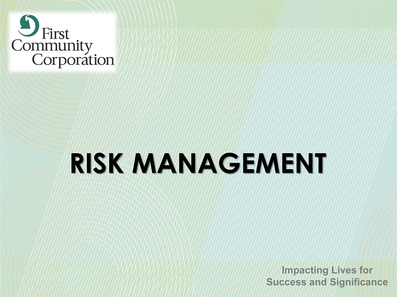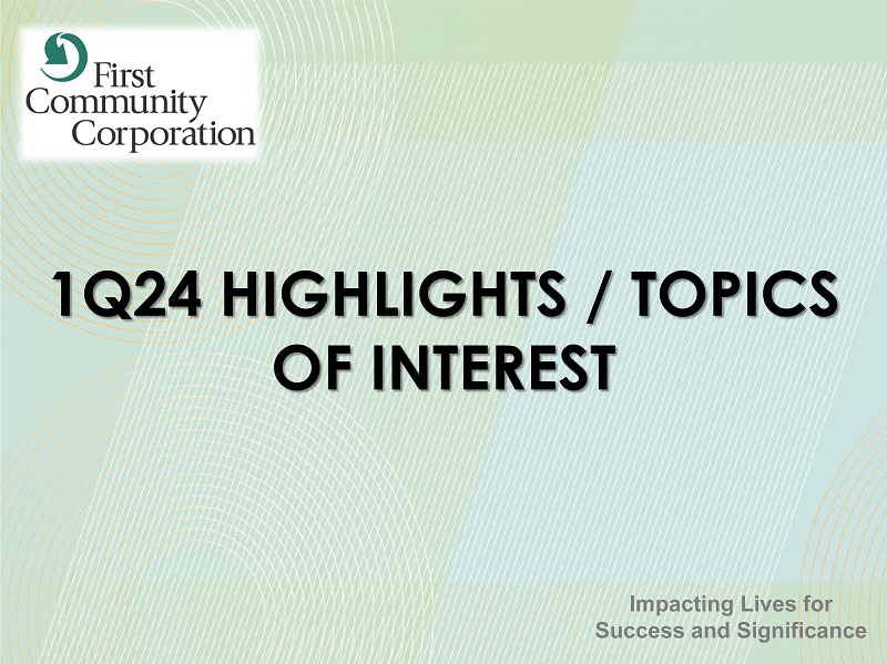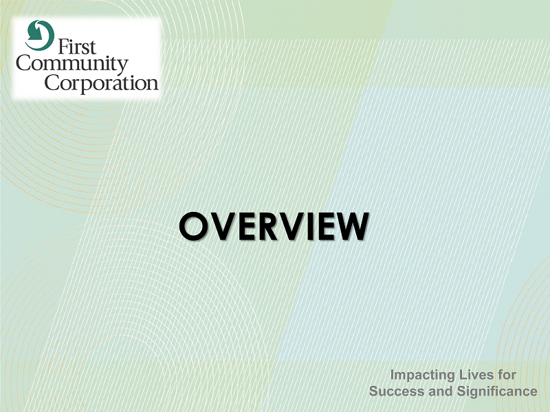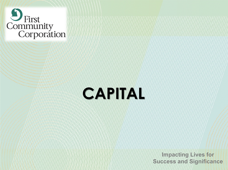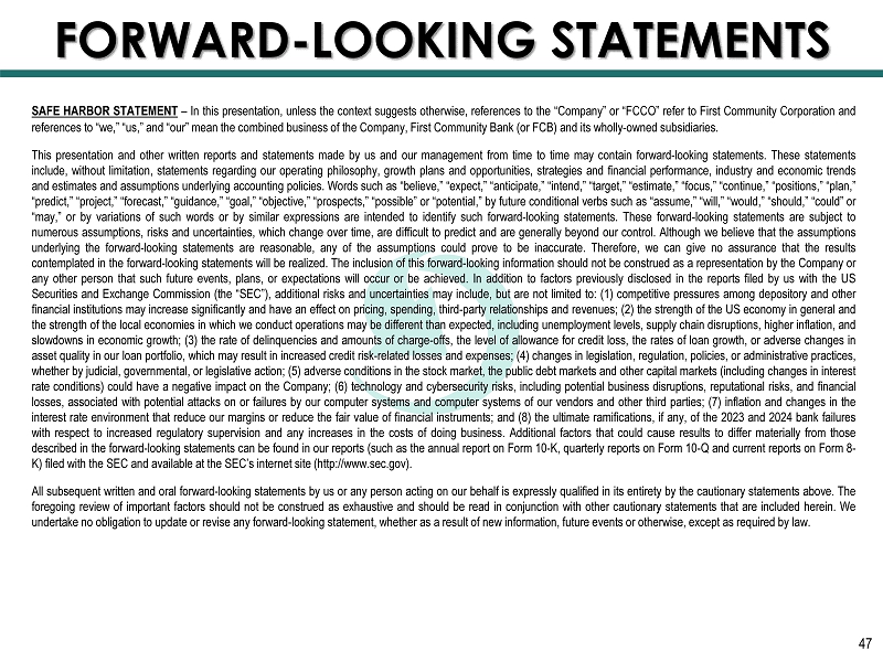 FORWARD - LOOKING STATEMENTS 47 SAFE HARBOR STATEMENT – In this presentation, unless the context suggests otherwise, references to the “Company” or “FCCO” refer to First Community Corporation and references to “we,” “us,” and “our” mean the combined business of the Company, First Community Bank (or FCB) and its wholly - owned subsidiaries . This presentation and other written reports and statements made by us and our management from time to time may contain forward - looking statements . These statements include, without limitation, statements regarding our operating philosophy, growth plans and opportunities, strategies and financial performance, industry and economic trends and estimates and assumptions underlying accounting policies . Words such as “believe,” “expect,” “anticipate,” “intend,” “target,” “estimate,” “focus,” “continue,” “positions,” “plan,” “predict,” “project,” “forecast,” “guidance,” “goal,” “objective,” “prospects,” “possible” or “potential,” by future conditional verbs such as “assume,” “will,” “would,” “should,” “could” or “may,” or by variations of such words or by similar expressions are intended to identify such forward - looking statements . These forward - looking statements are subject to numerous assumptions, risks and uncertainties, which change over time, are difficult to predict and are generally beyond our control . Although we believe that the assumptions underlying the forward - looking statements are reasonable, any of the assumptions could prove to be inaccurate . Therefore, we can give no assurance that the results contemplated in the forward - looking statements will be realized . The inclusion of this forward - looking information should not be construed as a representation by the Company or any other person that such future events, plans, or expectations will occur or be achieved . In addition to factors previously disclosed in the reports filed by us with the US Securities and Exchange Commission (the “SEC”), additional risks and uncertainties may include, but are not limited to : ( 1 ) competitive pressures among depository and other financial institutions may increase significantly and have an effect on pricing, spending, third - party relationships and revenues ; ( 2 ) the strength of the US economy in general and the strength of the local economies in which we conduct operations may be different than expected, including unemployment levels, supply chain disruptions, higher inflation, and slowdowns in economic growth ; ( 3 ) the rate of delinquencies and amounts of charge - offs, the level of allowance for credit loss, the rates of loan growth, or adverse changes in asset quality in our loan portfolio, which may result in increased credit risk - related losses and expenses ; ( 4 ) changes in legislation, regulation, policies, or administrative practices, whether by judicial, governmental, or legislative action ; ( 5 ) adverse conditions in the stock market, the public debt markets and other capital markets (including changes in interest rate conditions) could have a negative impact on the Company ; ( 6 ) technology and cybersecurity risks, including potential business disruptions, reputational risks, and financial losses, associated with potential attacks on or failures by our computer systems and computer systems of our vendors and other third parties ; ( 7 ) inflation and changes in the interest rate environment that reduce our margins or reduce the fair value of financial instruments ; and ( 8 ) the ultimate ramifications, if any, of the 2023 and 2024 bank failures with respect to increased regulatory supervision and any increases in the costs of doing business . Additional factors that could cause results to differ materially from those described in the forward - looking statements can be found in our reports (such as the annual report on Form 10 - K, quarterly reports on Form 10 - Q and current reports on Form 8 - K) filed with the SEC and available at the SEC’s internet site (http : //www . sec . gov) . All subsequent written and oral forward - looking statements by us or any person acting on our behalf is expressly qualified in its entirety by the cautionary statements above . The foregoing review of important factors should not be construed as exhaustive and should be read in conjunction with other cautionary statements that are included herein . We undertake no obligation to update or revise any forward - looking statement, whether as a result of new information, future events or otherwise, except as required by law .