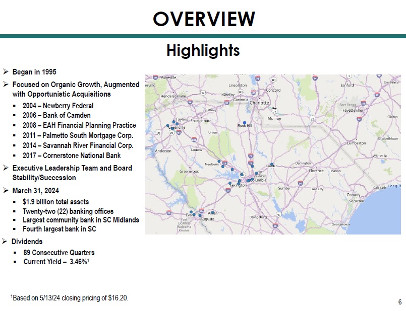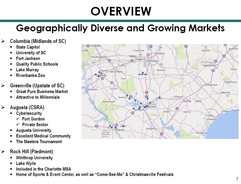 » Began in 1995 » Focused on Organic Growth, Augmented with Opportunistic Acquisitions ▪ 2004 – Newberry Federal ▪ 2006 – Bank of Camden ▪ 2008 – EAH Financial Planning Practice ▪ 2011 – Palmetto South Mortgage Corp. ▪ 2014 – Savannah River Financial Corp. ▪ 2017 – Cornerstone National Bank » Executive Leadership Team and Board Stability/Succession » March 31, 2024 ▪ $1.9 billion total assets ▪ Twenty - two (22) banking offices ▪ Largest community bank in SC Midlands ▪ Fourth largest bank in SC » Dividends ▪ 89 Consecutive Quarters ▪ Current Yield – 3.46% 1 OVERVIEW Highlights Rock Hill 1 Based on 5/13/24 closing pricing of $16.20. 6
