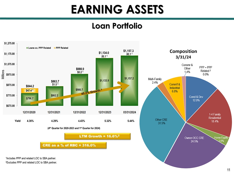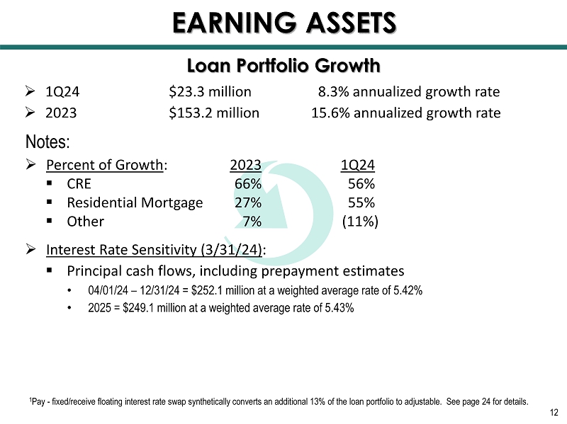 Loan Portfolio LTM Growth = 16.6% 2 1 Includes PPP and related LOC to SBA partner. 2 Excludes PPP and related LOC to SBA partner. CRE as a % of RBC = 316.0% (4 th Quarter for 2020 - 2023 and 1 st Quarter for 2024) $980.9 $1,134.0 $844.2 Yield 4.36% 4.29% 4.43% 5.32% 5.44% 11 EARNING ASSETS $1,157.3 Composition 3/31/24 Millions $863.7