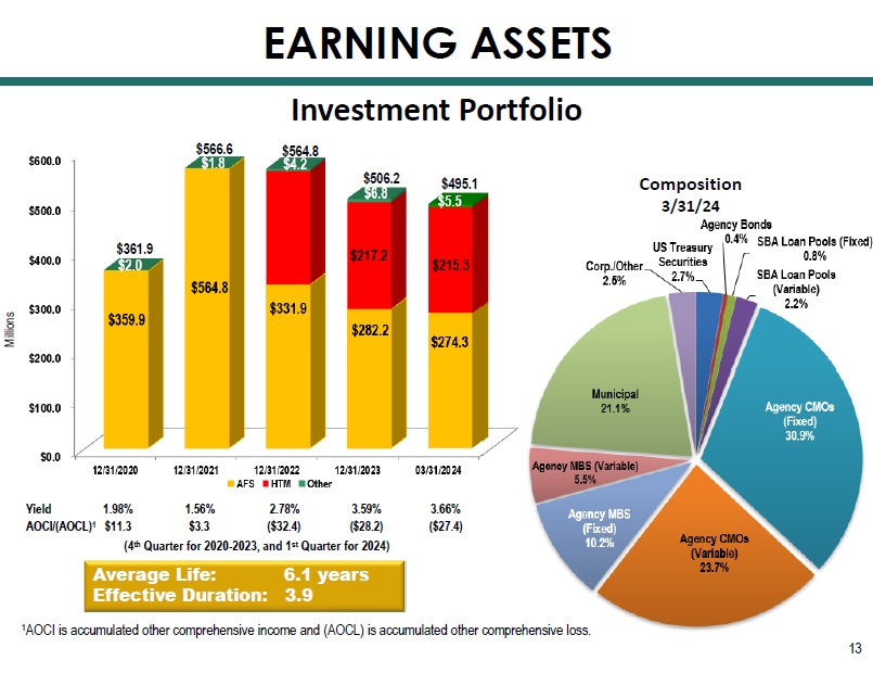 » 1Q24 $23.3 million 8.3% annualized growth rate » 2023 $153.2 million 15.6% annualized growth rate Notes: » Percent of Growth : 2023 1Q24 ▪ CRE 66% 56% ▪ Residential Mortgage 27% 55% ▪ Other 7% (11%) » Interest Rate Sensitivity (3/31/24) : ▪ Principal cash flows, including prepayment estimates • 04/01/24 – 12/31/24 = $252.1 million at a weighted average rate of 5.42% • 2025 = $249.1 million at a weighted average rate of 5.43% 12 1 Pay - fixed/receive floating interest rate swap synthetically converts an additional 13% of the loan portfolio to adjustable. S ee page 24 for details. Loan Portfolio Growth EARNING ASSETS