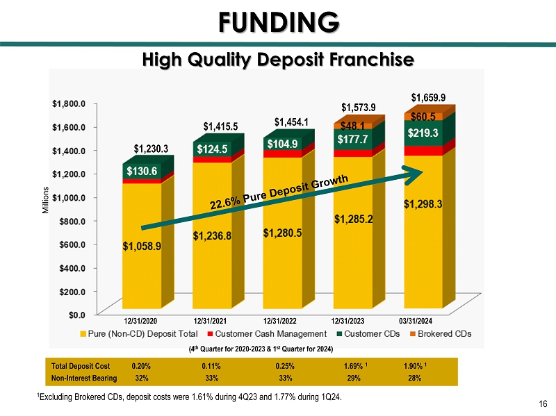 Investment Portfolio Yield 1.98% 1.56% 2.78% 3.59% 3.66% AOCI/(AOCL) 1 $11.3 $3.3 ($32.4) ($28.2) ($27.4) (4 th Quarter for 2020 - 2023, and 1 st Quarter for 2024) Average Life: 6.1 years Effective Duration: 3.9 Composition 3/31/24 $361.9 $564.8 $506.2 EARNING ASSETS Millions $495.1 13 $566.6 1 AOCI is accumulated other comprehensive income and (AOCL) is accumulated other comprehensive loss.