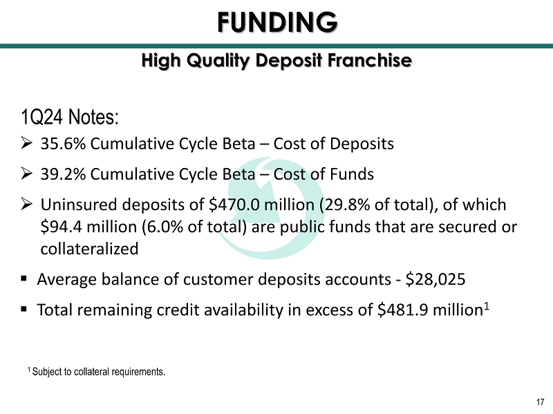 Total Deposit Cost 0.20% 0.11% 0.25% 1.69% 1 1.90% 1 Non - Interest Bearing 32% 33% 33% 29% 28% Millions $1,230.3 $1,415.5 $1,454.1 $1,573.9 (4 th Quarter for 2020 - 2023 & 1 st Quarter for 2024) 16 High Quality Deposit Franchise $1,659.9 FUNDING 12/31/2020 12/31/2021 12/31/2022 12/31/2023 03/31/2 024 1 Excluding Brokered CDs, deposit costs were 1.61% during 4Q23 and 1.77% during 1Q24.