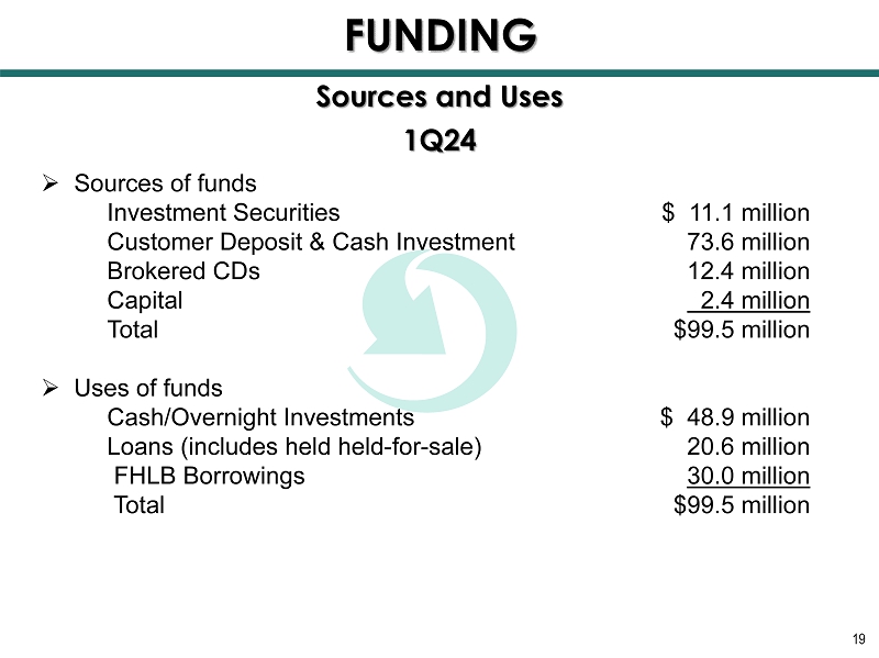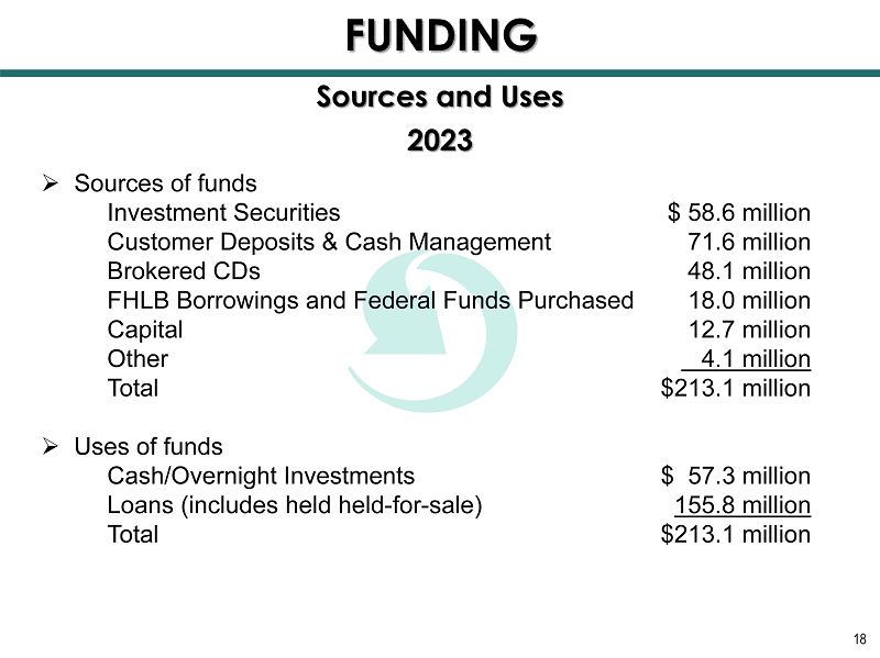 18 2023 » Sources of funds Investment Securities $ 58.6 million Customer Deposits & Cash Management 71.6 million Brokered CDs 48.1 million FHLB Borrowings and Federal Funds Purchased 1 8.0 million Capital 12.7 million Other 4.1 million Total $213.1 million » Uses of funds Cash/ Overnight Investments $ 57.3 million Loans (includes held held - for - sale) 155.8 million Total $213.1 million Sources and Uses FUNDING