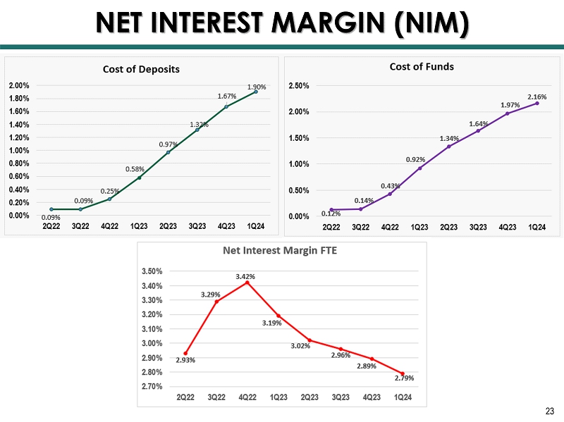 24 Notes: » Evidence of NIM Flattening NIM (non - FTE basis) • December 2023 2.81% • January 2024 2.79% • February 2024 2.77% • March 2024 2.79 % » $17.7 Million Brokered CD • All - in cost of 5.70% • Called on April 25, 2024 » Effective May 5, 2023, entered into a pay - fixed /receive floating interest rate • Notional amount: $150 million • Synthetically converts approximately 13% of the Loan Portfolio from fixed to floating • Pay a fixed rate of 3.58% • Receive a floating rate of overnight SOFR • Matures on May 5, 2026 • 1Q24 Impact ▪ Interest Income $649 thousand ▪ Loan Portfolio Yield 23 bps ▪ Net Interest Margin 15 bps NET INTEREST MARGIN (NIM)