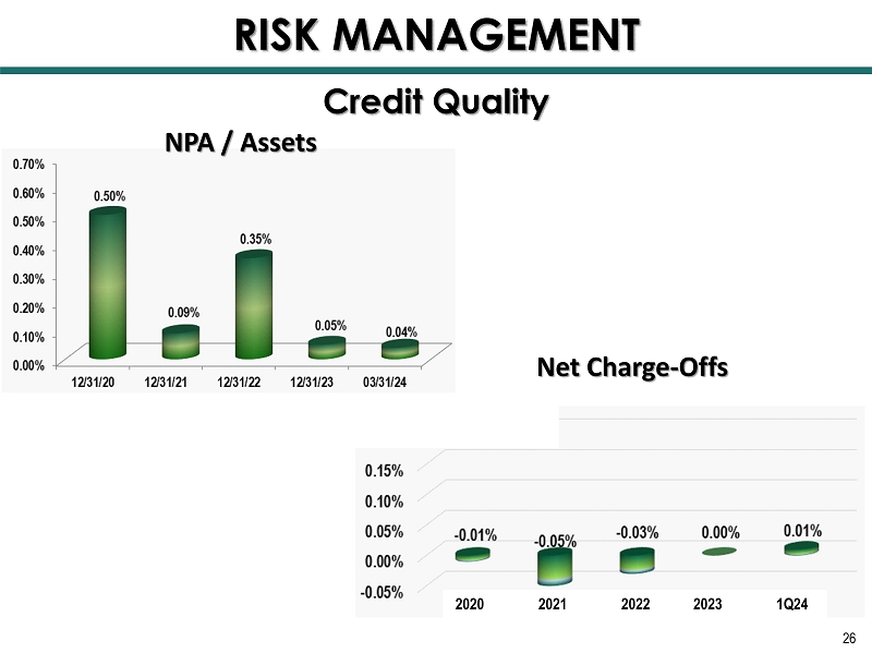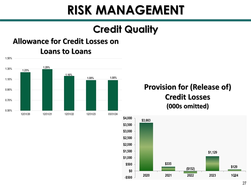 26 Credit Quality RISK MANAGEMENT 2020 2021 2022 2023 1Q24 NPA / Assets Net Charge - Offs
