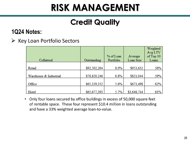 1Q24 Notes: » Key Loan Portfolio Sectors 28 • Only four loans secured by office buildings in excess of 50,000 square feet of rentable space. These four represent $10.4 million in loans outstanding and have a 33% weighted average loan - to - value. Credit Quality RISK MANAGEMENT