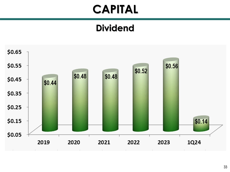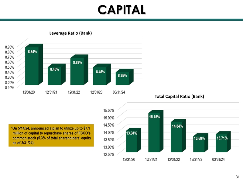 31 Leverage Ratio (Bank) Total Capital Ratio (Bank) CAPITAL *On 5/14/24, announced a plan to utilize up to $7.1 million of capital to repurchase shares of FCCO’s common stock (5.3% of total shareholders’ equity as of 3/31/24).