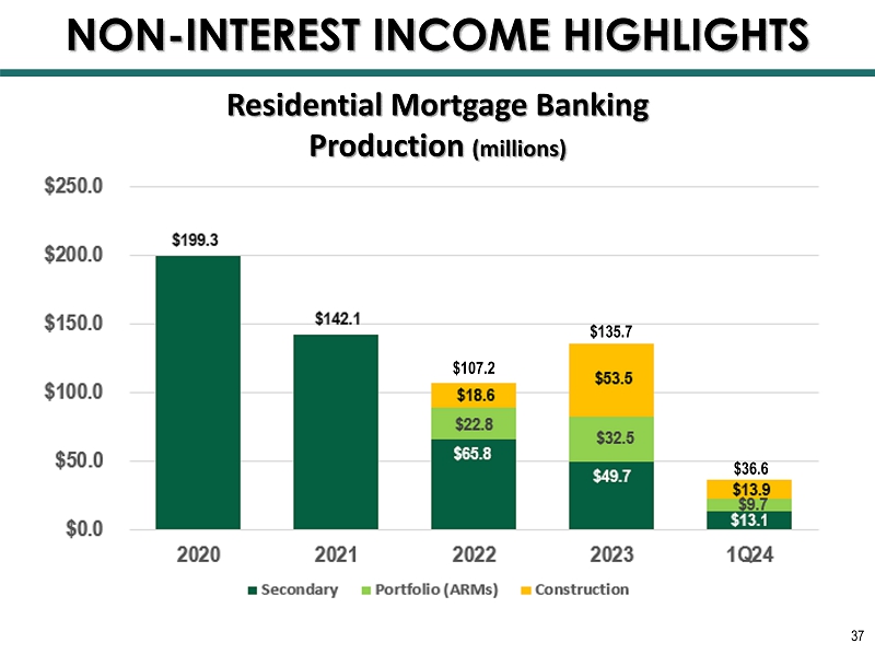 Financial Planning / Investment Advisory Services Revenue and Pre - Tax Income (thousands) 36 Pre - tax Profit Margin 29.7% 30.5% 33.9% 31.0% 31.9% NON - INTEREST INCOME HIGHLIGHTS