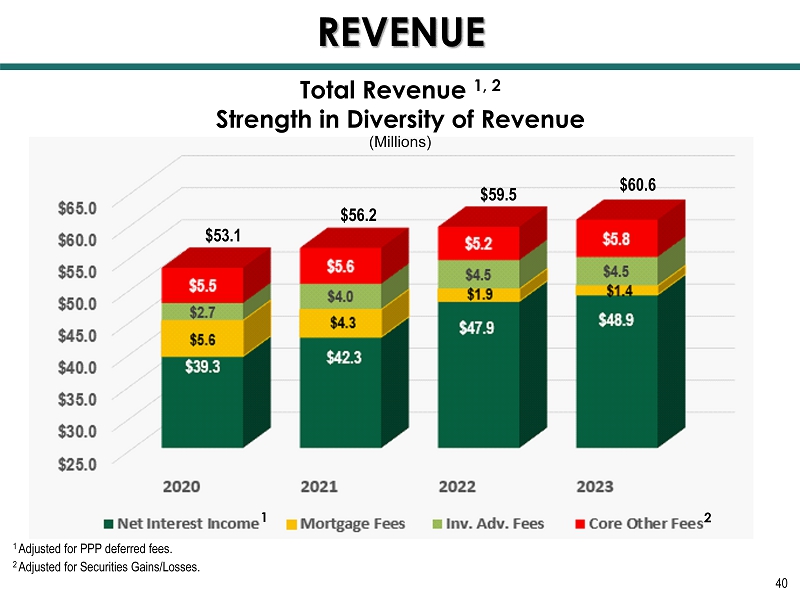 40 (Millions) $53.1 $56.2 $60.6 $59.5 Total Revenue 1, 2 Strength in Diversity of Revenue REVENUE 1 Adjusted for PPP deferred fees. 2 Adjusted for Securities Gains/Losses. 2 1