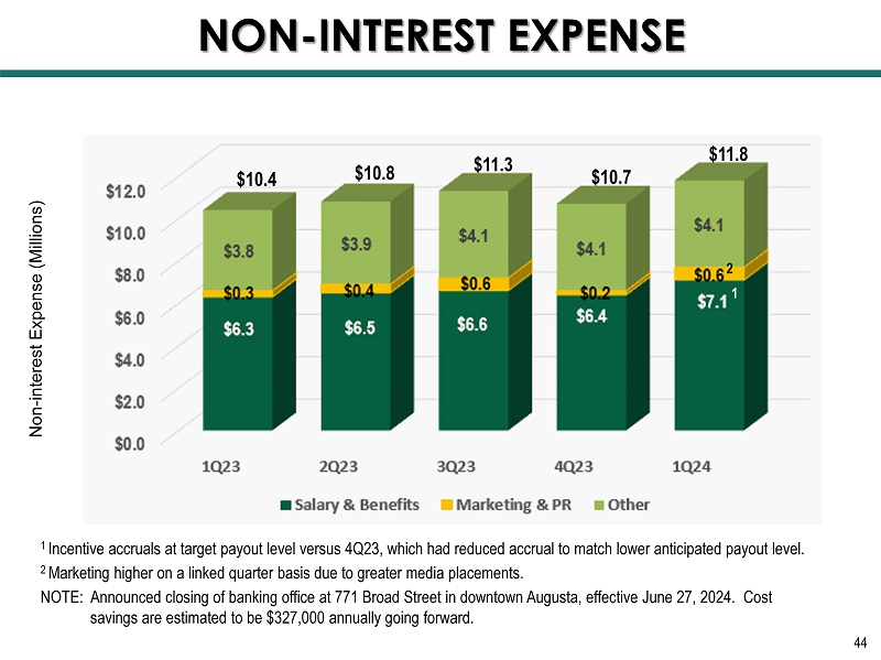 NON - INTEREST EXPENSE 44 Non - interest Expense (Millions) $10.4 $10.8 $11.8 1 Incentive accruals at target payout level versus 4Q23, which had reduced accrual to match lower anticipated payout level. 2 Marketing higher on a linked quarter basis due to greater media placements. NOTE: Announced closing of banking office at 771 Broad Street in downtown Augusta, effective June 27, 2024. Cost savings are estimated to be $327,000 annually going forward. $11.3 $10.7 1 2