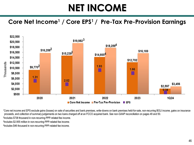 1 Core net income and EPS exclude gains (losses) on sale of securities and bank premises, write - downs on bank premises held - for - sa le, non - recurring BOLI income, gains on insurance proceeds, and collection of summary judgements on two loans charged off at an FCCO acquired bank. S ee non - GAAP reconciliation on pages 49 and 50. 2 Includes $738 thousand in non - recurring PPP - related fee income. 3 Includes $2.955 million in non - recurring PPP - related fee income. 4 Includes $46 thousand in non - recurring PPP - related fee income. Thousands Core Net Income 1 / Core EPS 1 / Pre - Tax Pre - Provision Earnings 46 NET INCOME 2 3 2 3 4 4