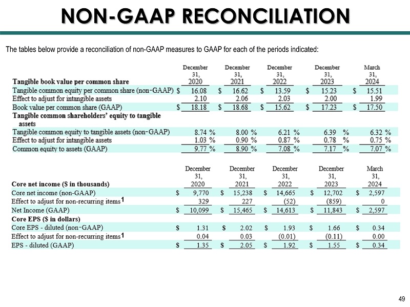 NON - GAAP RECONCILIATION 50 1 Excludes gains (losses) on sale of securities and bank premises, write - downs on bank premises held - for - sale, non - recurring BOLI income, gains on insuranc e proceeds, and collection of summary judgements on two loans charged off at an FCCO acquired bank. The tables below provide a reconciliation of non - GAAP measures to GAAP for each of the periods indicated: