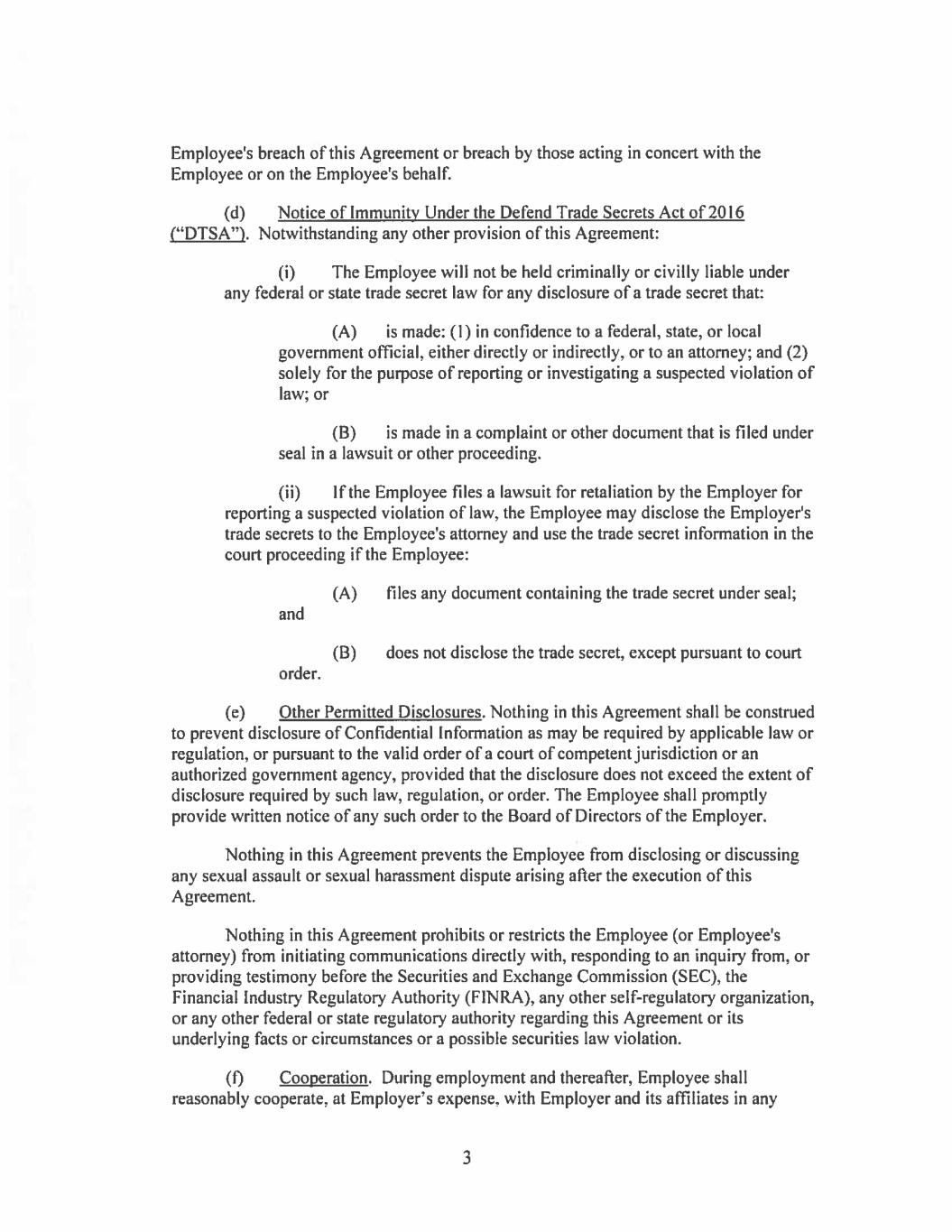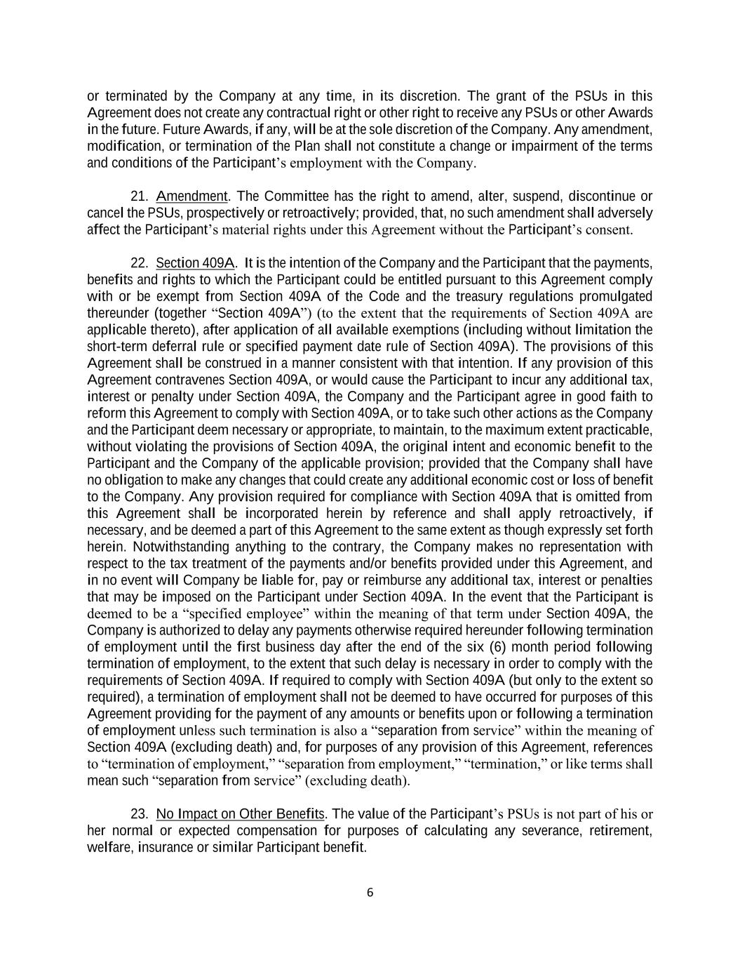 6 or terminated by the Company at any time, in its discretion. The grant of the PSUs in this Agreement does not create any contractual right or other right to receive any PSUs or other Awards in the future. Future Awards, if any, will be at the sole discretion of the Company. Any amendment, modification, or termination of the Plan shall not constitute a change or impairment of the terms and conditions of the Participant’s employment with the Company. 21. Amendment. The Committee has the right to amend, alter, suspend, discontinue or cancel the PSUs, prospectively or retroactively; provided, that, no such amendment shall adversely affect the Participant’s material rights under this Agreement without the Participant’s consent. 22. Section 409A. It is the intention of the Company and the Participant that the payments, benefits and rights to which the Participant could be entitled pursuant to this Agreement comply with or be exempt from Section 409A of the Code and the treasury regulations promulgated thereunder (together “Section 409A”) (to the extent that the requirements of Section 409A are applicable thereto), after application of all available exemptions (including without limitation the short-term deferral rule or specified payment date rule of Section 409A). The provisions of this Agreement shall be construed in a manner consistent with that intention. If any provision of this Agreement contravenes Section 409A, or would cause the Participant to incur any additional tax, interest or penalty under Section 409A, the Company and the Participant agree in good faith to reform this Agreement to comply with Section 409A, or to take such other actions as the Company and the Participant deem necessary or appropriate, to maintain, to the maximum extent practicable, without violating the provisions of Section 409A, the original intent and economic benefit to the Participant and the Company of the applicable provision; provided that the Company shall have no obligation to make any changes that could create any additional economic cost or loss of benefit to the Company. Any provision required for compliance with Section 409A that is omitted from this Agreement shall be incorporated herein by reference and shall apply retroactively, if necessary, and be deemed a part of this Agreement to the same extent as though expressly set forth herein. Notwithstanding anything to the contrary, the Company makes no representation with respect to the tax treatment of the payments and/or benefits provided under this Agreement, and in no event will Company be liable for, pay or reimburse any additional tax, interest or penalties that may be imposed on the Participant under Section 409A. In the event that the Participant is deemed to be a “specified employee” within the meaning of that term under Section 409A, the Company is authorized to delay any payments otherwise required hereunder following termination of employment until the first business day after the end of the six (6) month period following termination of employment, to the extent that such delay is necessary in order to comply with the requirements of Section 409A. If required to comply with Section 409A (but only to the extent so required), a termination of employment shall not be deemed to have occurred for purposes of this Agreement providing for the payment of any amounts or benefits upon or following a termination of employment unless such termination is also a “separation from service” within the meaning of Section 409A (excluding death) and, for purposes of any provision of this Agreement, references to “termination of employment,” “separation from employment,” “termination,” or like terms shall mean such “separation from service” (excluding death). 23. No Impact on Other Benefits. The value of the Participant’s PSUs is not part of his or her normal or expected compensation for purposes of calculating any severance, retirement, welfare, insurance or similar Participant benefit.