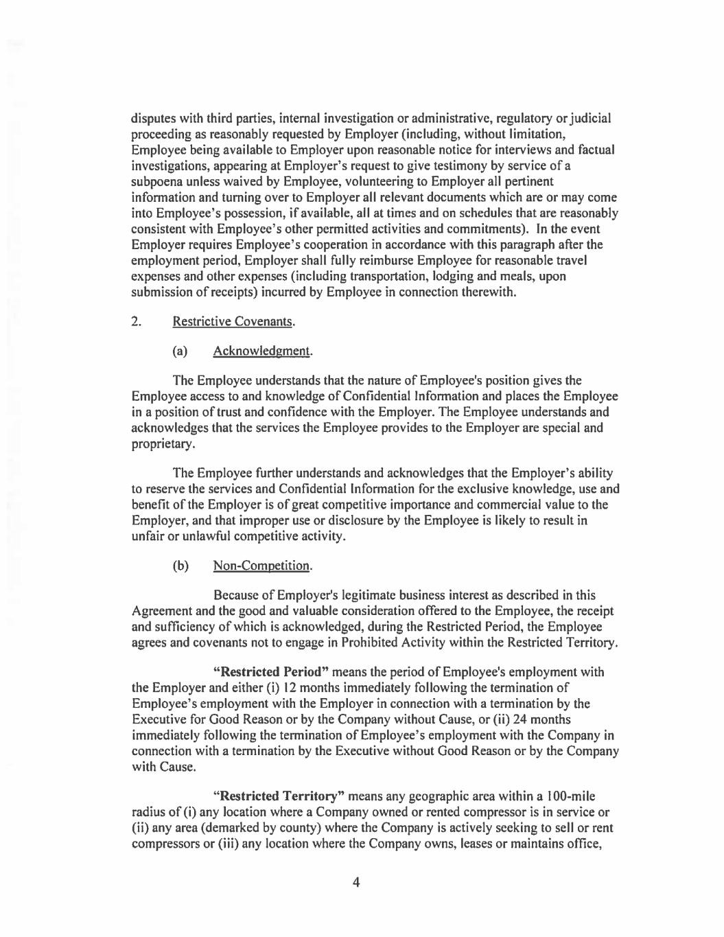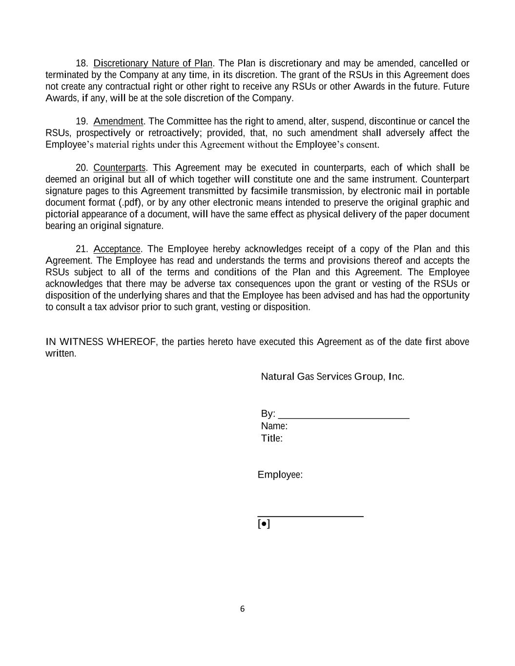 6 18. Discretionary Nature of Plan. The Plan is discretionary and may be amended, cancelled or terminated by the Company at any time, in its discretion. The grant of the RSUs in this Agreement does not create any contractual right or other right to receive any RSUs or other Awards in the future. Future Awards, if any, will be at the sole discretion of the Company. 19. Amendment. The Committee has the right to amend, alter, suspend, discontinue or cancel the RSUs, prospectively or retroactively; provided, that, no such amendment shall adversely affect the Employee’s material rights under this Agreement without the Employee’s consent. 20. Counterparts. This Agreement may be executed in counterparts, each of which shall be deemed an original but all of which together will constitute one and the same instrument. Counterpart signature pages to this Agreement transmitted by facsimile transmission, by electronic mail in portable document format (.pdf), or by any other electronic means intended to preserve the original graphic and pictorial appearance of a document, will have the same effect as physical delivery of the paper document bearing an original signature. 21. Acceptance. The Employee hereby acknowledges receipt of a copy of the Plan and this Agreement. The Employee has read and understands the terms and provisions thereof and accepts the RSUs subject to all of the terms and conditions of the Plan and this Agreement. The Employee acknowledges that there may be adverse tax consequences upon the grant or vesting of the RSUs or disposition of the underlying shares and that the Employee has been advised and has had the opportunity to consult a tax advisor prior to such grant, vesting or disposition. IN WITNESS WHEREOF, the parties hereto have executed this Agreement as of the date first above written. Natural Gas Services Group, Inc. By: __________________________ Name: Title: Employee: _____________________ [●]