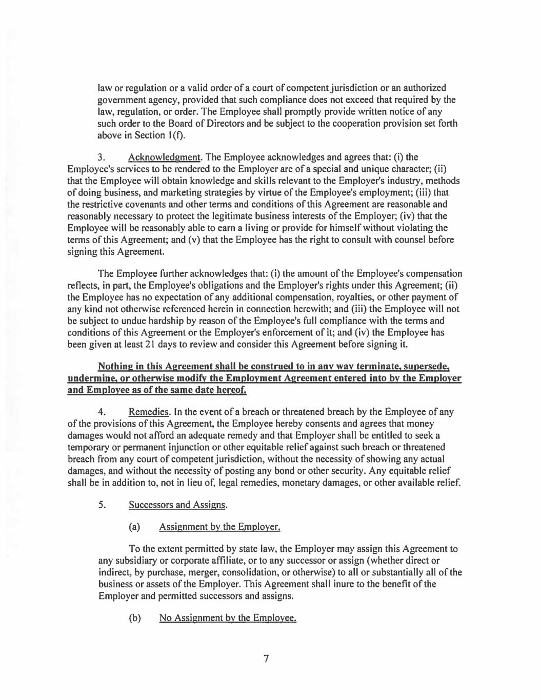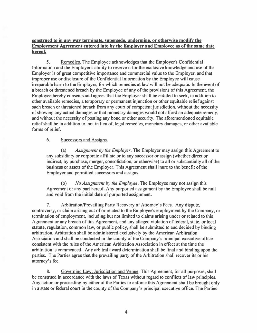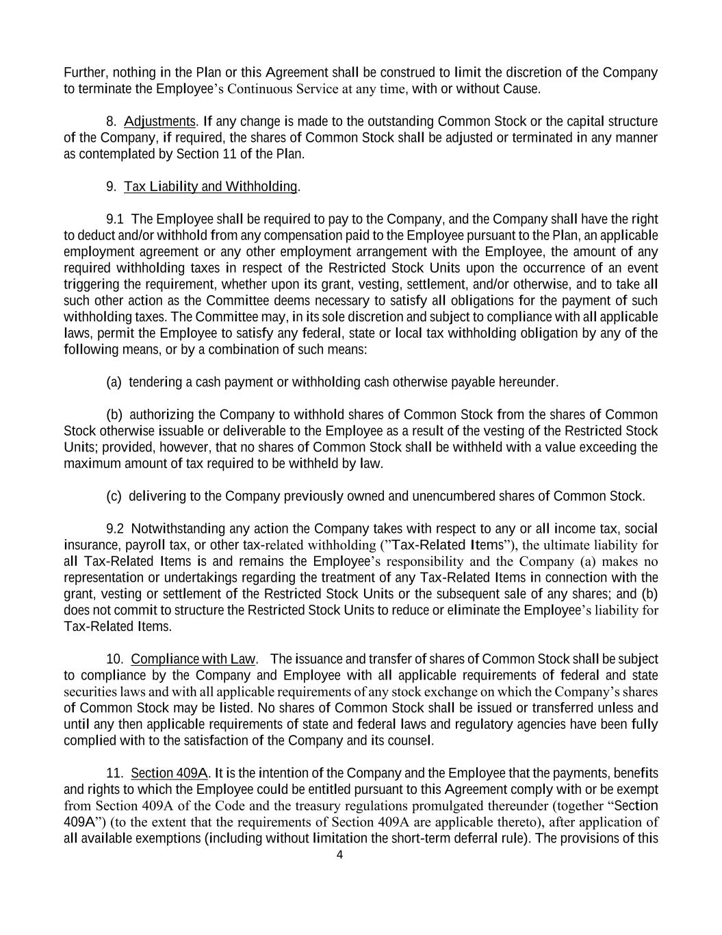 4 Further, nothing in the Plan or this Agreement shall be construed to limit the discretion of the Company to terminate the Employee’s Continuous Service at any time, with or without Cause. 8. Adjustments. If any change is made to the outstanding Common Stock or the capital structure of the Company, if required, the shares of Common Stock shall be adjusted or terminated in any manner as contemplated by Section 11 of the Plan. 9. Tax Liability and Withholding. 9.1 The Employee shall be required to pay to the Company, and the Company shall have the right to deduct and/or withhold from any compensation paid to the Employee pursuant to the Plan, an applicable employment agreement or any other employment arrangement with the Employee, the amount of any required withholding taxes in respect of the Restricted Stock Units upon the occurrence of an event triggering the requirement, whether upon its grant, vesting, settlement, and/or otherwise, and to take all such other action as the Committee deems necessary to satisfy all obligations for the payment of such withholding taxes. The Committee may, in its sole discretion and subject to compliance with all applicable laws, permit the Employee to satisfy any federal, state or local tax withholding obligation by any of the following means, or by a combination of such means: (a) tendering a cash payment or withholding cash otherwise payable hereunder. (b) authorizing the Company to withhold shares of Common Stock from the shares of Common Stock otherwise issuable or deliverable to the Employee as a result of the vesting of the Restricted Stock Units; provided, however, that no shares of Common Stock shall be withheld with a value exceeding the maximum amount of tax required to be withheld by law. (c) delivering to the Company previously owned and unencumbered shares of Common Stock. 9.2 Notwithstanding any action the Company takes with respect to any or all income tax, social insurance, payroll tax, or other tax-related withholding (”Tax-Related Items”), the ultimate liability for all Tax-Related Items is and remains the Employee’s responsibility and the Company (a) makes no representation or undertakings regarding the treatment of any Tax-Related Items in connection with the grant, vesting or settlement of the Restricted Stock Units or the subsequent sale of any shares; and (b) does not commit to structure the Restricted Stock Units to reduce or eliminate the Employee’s liability for Tax-Related Items. 10. Compliance with Law. The issuance and transfer of shares of Common Stock shall be subject to compliance by the Company and Employee with all applicable requirements of federal and state securities laws and with all applicable requirements of any stock exchange on which the Company’s shares of Common Stock may be listed. No shares of Common Stock shall be issued or transferred unless and until any then applicable requirements of state and federal laws and regulatory agencies have been fully complied with to the satisfaction of the Company and its counsel. 11. Section 409A. It is the intention of the Company and the Employee that the payments, benefits and rights to which the Employee could be entitled pursuant to this Agreement comply with or be exempt from Section 409A of the Code and the treasury regulations promulgated thereunder (together “Section 409A”) (to the extent that the requirements of Section 409A are applicable thereto), after application of all available exemptions (including without limitation the short-term deferral rule). The provisions of this