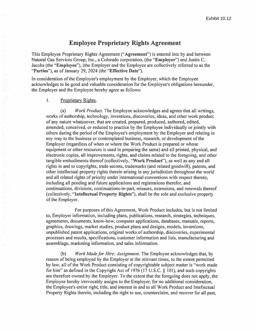 | Employee Proprietary Rights Agreement between Justin C. Jacobs and Natural Gas Services Group, Inc. dated January 29, 2024 (Incorporated by reference to Exhibit 10.3 of the Registrant’s Current Report on Form 8-K filed with the Securities and Exchange Commission on February 1, 2024.) |