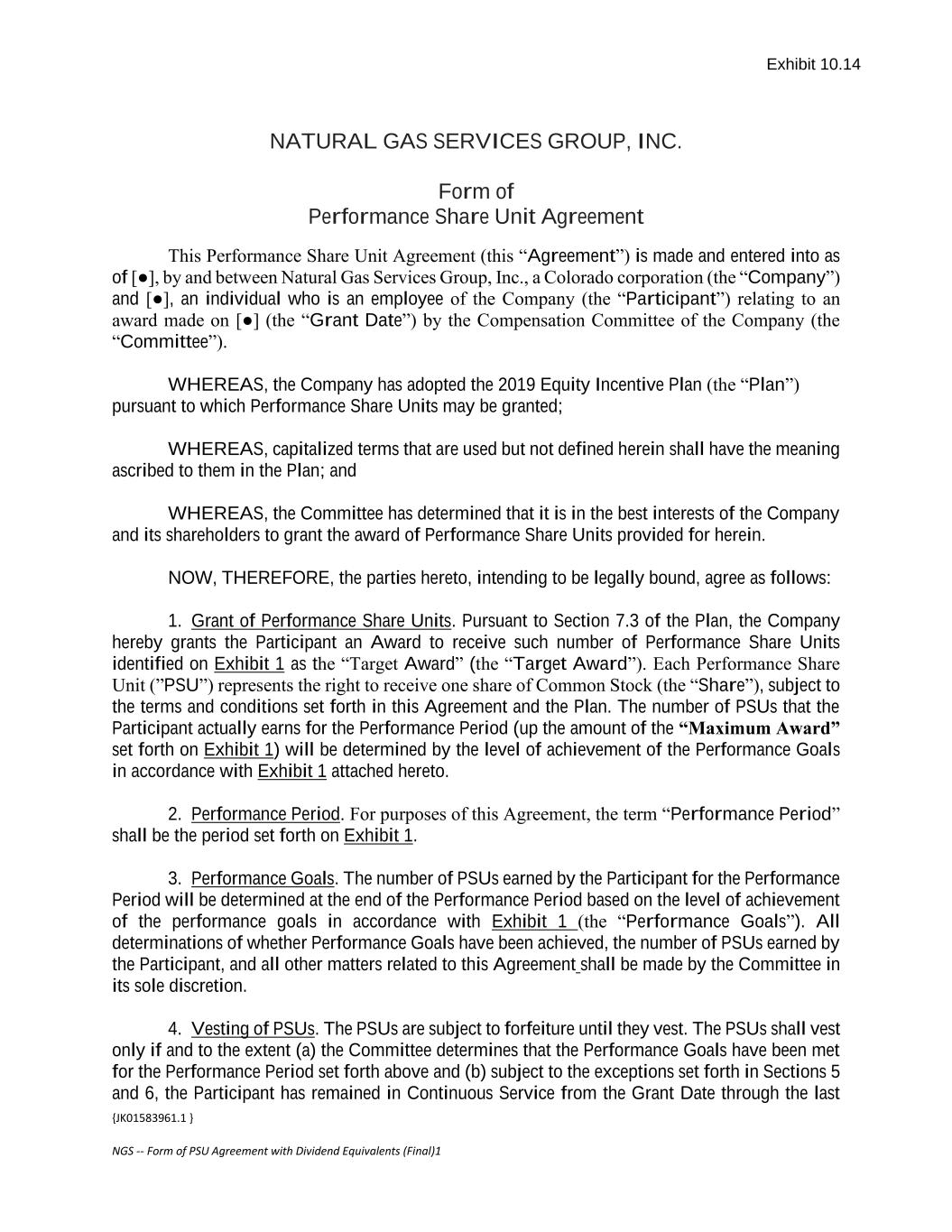 {JK01583961.1 } NGS -- Form of PSU Agreement with Dividend Equivalents (Final)1 NATURAL GAS SERVICES GROUP, INC. Form of Performance Share Unit Agreement This Performance Share Unit Agreement (this “Agreement”) is made and entered into as of [●], by and between Natural Gas Services Group, Inc., a Colorado corporation (the “Company”) and [●], an individual who is an employee of the Company (the “Participant”) relating to an award made on [●] (the “Grant Date”) by the Compensation Committee of the Company (the “Committee”). WHEREAS, the Company has adopted the 2019 Equity Incentive Plan (the “Plan”) pursuant to which Performance Share Units may be granted; WHEREAS, capitalized terms that are used but not defined herein shall have the meaning ascribed to them in the Plan; and WHEREAS, the Committee has determined that it is in the best interests of the Company and its shareholders to grant the award of Performance Share Units provided for herein. NOW, THEREFORE, the parties hereto, intending to be legally bound, agree as follows: 1. Grant of Performance Share Units. Pursuant to Section 7.3 of the Plan, the Company hereby grants the Participant an Award to receive such number of Performance Share Units identified on Exhibit 1 as the “Target Award” (the “Target Award”). Each Performance Share Unit (”PSU”) represents the right to receive one share of Common Stock (the “Share”), subject to the terms and conditions set forth in this Agreement and the Plan. The number of PSUs that the Participant actually earns for the Performance Period (up the amount of the “Maximum Award” set forth on Exhibit 1) will be determined by the level of achievement of the Performance Goals in accordance with Exhibit 1 attached hereto. 2. Performance Period. For purposes of this Agreement, the term “Performance Period” shall be the period set forth on Exhibit 1. 3. Performance Goals. The number of PSUs earned by the Participant for the Performance Period will be determined at the end of the Performance Period based on the level of achievement of the performance goals in accordance with Exhibit 1 (the “Performance Goals”). All determinations of whether Performance Goals have been achieved, the number of PSUs earned by the Participant, and all other matters related to this Agreement shall be made by the Committee in its sole discretion. 4. Vesting of PSUs. The PSUs are subject to forfeiture until they vest. The PSUs shall vest only if and to the extent (a) the Committee determines that the Performance Goals have been met for the Performance Period set forth above and (b) subject to the exceptions set forth in Sections 5 and 6, the Participant has remained in Continuous Service from the Grant Date through the last Exhibit 10.14