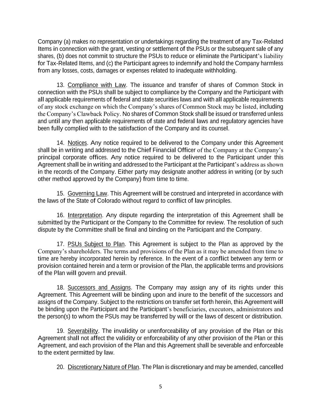 5 Company (a) makes no representation or undertakings regarding the treatment of any Tax-Related Items in connection with the grant, vesting or settlement of the PSUs or the subsequent sale of any shares, (b) does not commit to structure the PSUs to reduce or eliminate the Participant’s liability for Tax-Related Items, and (c) the Participant agrees to indemnify and hold the Company harmless from any losses, costs, damages or expenses related to inadequate withholding. 13. Compliance with Law. The issuance and transfer of shares of Common Stock in connection with the PSUs shall be subject to compliance by the Company and the Participant with all applicable requirements of federal and state securities laws and with all applicable requirements of any stock exchange on which the Company’s shares of Common Stock may be listed, including the Company’s Clawback Policy. No shares of Common Stock shall be issued or transferred unless and until any then applicable requirements of state and federal laws and regulatory agencies have been fully complied with to the satisfaction of the Company and its counsel. 14. Notices. Any notice required to be delivered to the Company under this Agreement shall be in writing and addressed to the Chief Financial Officer of the Company at the Company’s principal corporate offices. Any notice required to be delivered to the Participant under this Agreement shall be in writing and addressed to the Participant at the Participant’s address as shown in the records of the Company. Either party may designate another address in writing (or by such other method approved by the Company) from time to time. 15. Governing Law. This Agreement will be construed and interpreted in accordance with the laws of the State of Colorado without regard to conflict of law principles. 16. Interpretation. Any dispute regarding the interpretation of this Agreement shall be submitted by the Participant or the Company to the Committee for review. The resolution of such dispute by the Committee shall be final and binding on the Participant and the Company. 17. PSUs Subject to Plan. This Agreement is subject to the Plan as approved by the Company’s shareholders. The terms and provisions of the Plan as it may be amended from time to time are hereby incorporated herein by reference. In the event of a conflict between any term or provision contained herein and a term or provision of the Plan, the applicable terms and provisions of the Plan will govern and prevail. 18. Successors and Assigns. The Company may assign any of its rights under this Agreement. This Agreement will be binding upon and inure to the benefit of the successors and assigns of the Company. Subject to the restrictions on transfer set forth herein, this Agreement will be binding upon the Participant and the Participant’s beneficiaries, executors, administrators and the person(s) to whom the PSUs may be transferred by will or the laws of descent or distribution. 19. Severability. The invalidity or unenforceability of any provision of the Plan or this Agreement shall not affect the validity or enforceability of any other provision of the Plan or this Agreement, and each provision of the Plan and this Agreement shall be severable and enforceable to the extent permitted by law. 20. Discretionary Nature of Plan. The Plan is discretionary and may be amended, cancelled