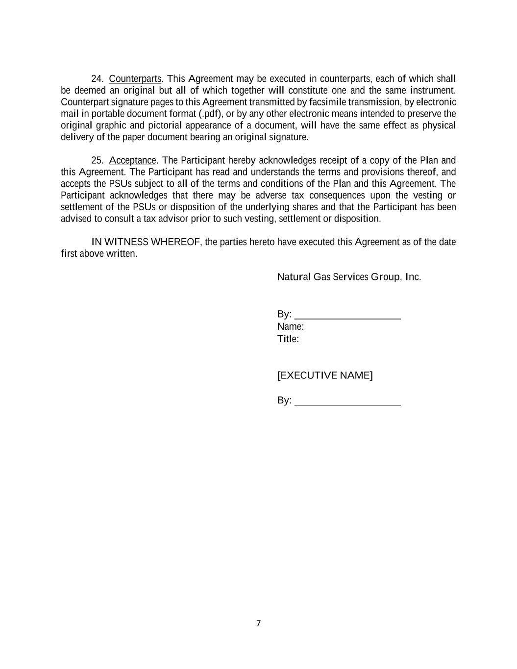 7 24. Counterparts. This Agreement may be executed in counterparts, each of which shall be deemed an original but all of which together will constitute one and the same instrument. Counterpart signature pages to this Agreement transmitted by facsimile transmission, by electronic mail in portable document format (.pdf), or by any other electronic means intended to preserve the original graphic and pictorial appearance of a document, will have the same effect as physical delivery of the paper document bearing an original signature. 25. Acceptance. The Participant hereby acknowledges receipt of a copy of the Plan and this Agreement. The Participant has read and understands the terms and provisions thereof, and accepts the PSUs subject to all of the terms and conditions of the Plan and this Agreement. The Participant acknowledges that there may be adverse tax consequences upon the vesting or settlement of the PSUs or disposition of the underlying shares and that the Participant has been advised to consult a tax advisor prior to such vesting, settlement or disposition. IN WITNESS WHEREOF, the parties hereto have executed this Agreement as of the date first above written. Natural Gas Services Group, Inc. By: _____________________ Name: Title: [EXECUTIVE NAME] By: _____________________