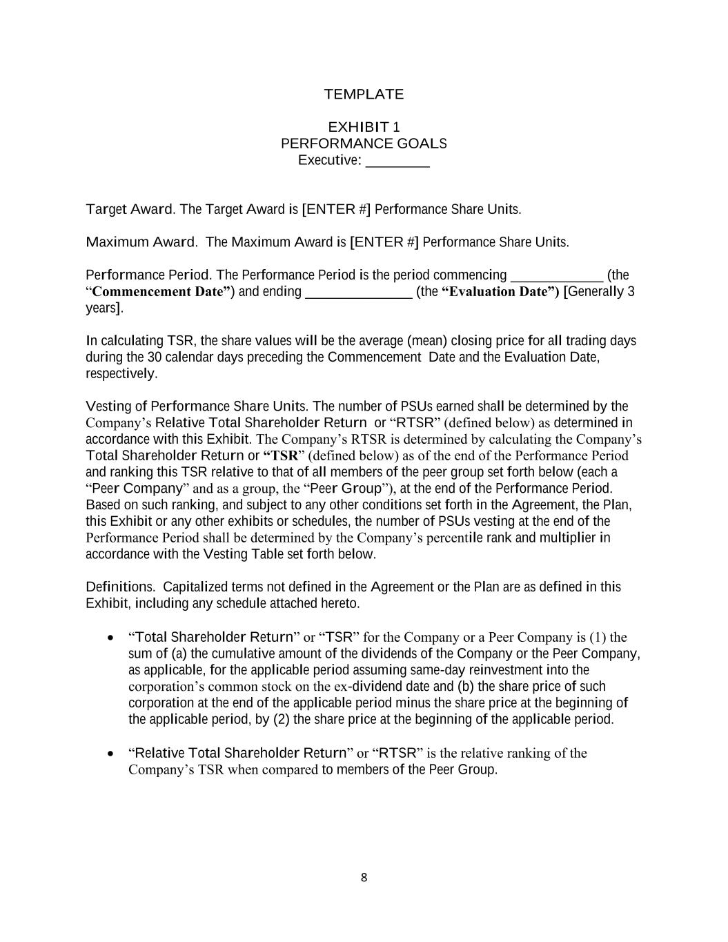 8 TEMPLATE EXHIBIT 1 PERFORMANCE GOALS Executive: _________ Target Award. The Target Award is [ENTER #] Performance Share Units. Maximum Award. The Maximum Award is [ENTER #] Performance Share Units. Performance Period. The Performance Period is the period commencing _____________ (the “Commencement Date”) and ending _______________ (the “Evaluation Date”) [Generally 3 years]. In calculating TSR, the share values will be the average (mean) closing price for all trading days during the 30 calendar days preceding the Commencement Date and the Evaluation Date, respectively. Vesting of Performance Share Units. The number of PSUs earned shall be determined by the Company’s Relative Total Shareholder Return or “RTSR” (defined below) as determined in accordance with this Exhibit. The Company’s RTSR is determined by calculating the Company’s Total Shareholder Return or “TSR” (defined below) as of the end of the Performance Period and ranking this TSR relative to that of all members of the peer group set forth below (each a “Peer Company” and as a group, the “Peer Group”), at the end of the Performance Period. Based on such ranking, and subject to any other conditions set forth in the Agreement, the Plan, this Exhibit or any other exhibits or schedules, the number of PSUs vesting at the end of the Performance Period shall be determined by the Company’s percentile rank and multiplier in accordance with the Vesting Table set forth below. Definitions. Capitalized terms not defined in the Agreement or the Plan are as defined in this Exhibit, including any schedule attached hereto. • “Total Shareholder Return” or “TSR” for the Company or a Peer Company is (1) the sum of (a) the cumulative amount of the dividends of the Company or the Peer Company, as applicable, for the applicable period assuming same-day reinvestment into the corporation’s common stock on the ex-dividend date and (b) the share price of such corporation at the end of the applicable period minus the share price at the beginning of the applicable period, by (2) the share price at the beginning of the applicable period. • “Relative Total Shareholder Return” or “RTSR” is the relative ranking of the Company’s TSR when compared to members of the Peer Group.