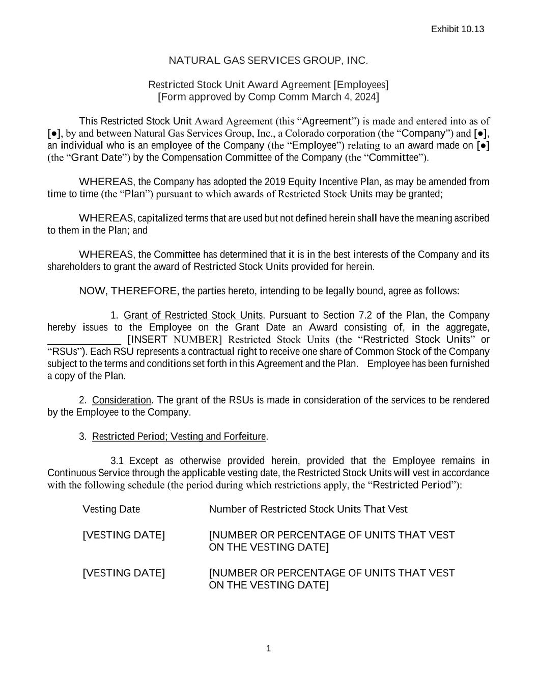 1 NATURAL GAS SERVICES GROUP, INC. Restricted Stock Unit Award Agreement [Employees] [Form approved by Comp Comm March 4, 2024] This Restricted Stock Unit Award Agreement (this “Agreement”) is made and entered into as of [●], by and between Natural Gas Services Group, Inc., a Colorado corporation (the “Company”) and [●], an individual who is an employee of the Company (the “Employee”) relating to an award made on [●] (the “Grant Date”) by the Compensation Committee of the Company (the “Committee”). WHEREAS, the Company has adopted the 2019 Equity Incentive Plan, as may be amended from time to time (the “Plan”) pursuant to which awards of Restricted Stock Units may be granted; WHEREAS, capitalized terms that are used but not defined herein shall have the meaning ascribed to them in the Plan; and WHEREAS, the Committee has determined that it is in the best interests of the Company and its shareholders to grant the award of Restricted Stock Units provided for herein. NOW, THEREFORE, the parties hereto, intending to be legally bound, agree as follows: 1. Grant of Restricted Stock Units. Pursuant to Section 7.2 of the Plan, the Company hereby issues to the Employee on the Grant Date an Award consisting of, in the aggregate, ______________ [INSERT NUMBER] Restricted Stock Units (the “Restricted Stock Units” or “RSUs”). Each RSU represents a contractual right to receive one share of Common Stock of the Company subject to the terms and conditions set forth in this Agreement and the Plan. Employee has been furnished a copy of the Plan. 2. Consideration. The grant of the RSUs is made in consideration of the services to be rendered by the Employee to the Company. 3. Restricted Period; Vesting and Forfeiture. 3.1 Except as otherwise provided herein, provided that the Employee remains in Continuous Service through the applicable vesting date, the Restricted Stock Units will vest in accordance with the following schedule (the period during which restrictions apply, the “Restricted Period”): Vesting Date Number of Restricted Stock Units That Vest [VESTING DATE] [NUMBER OR PERCENTAGE OF UNITS THAT VEST ON THE VESTING DATE] [VESTING DATE] [NUMBER OR PERCENTAGE OF UNITS THAT VEST ON THE VESTING DATE] Exhibit 10.13