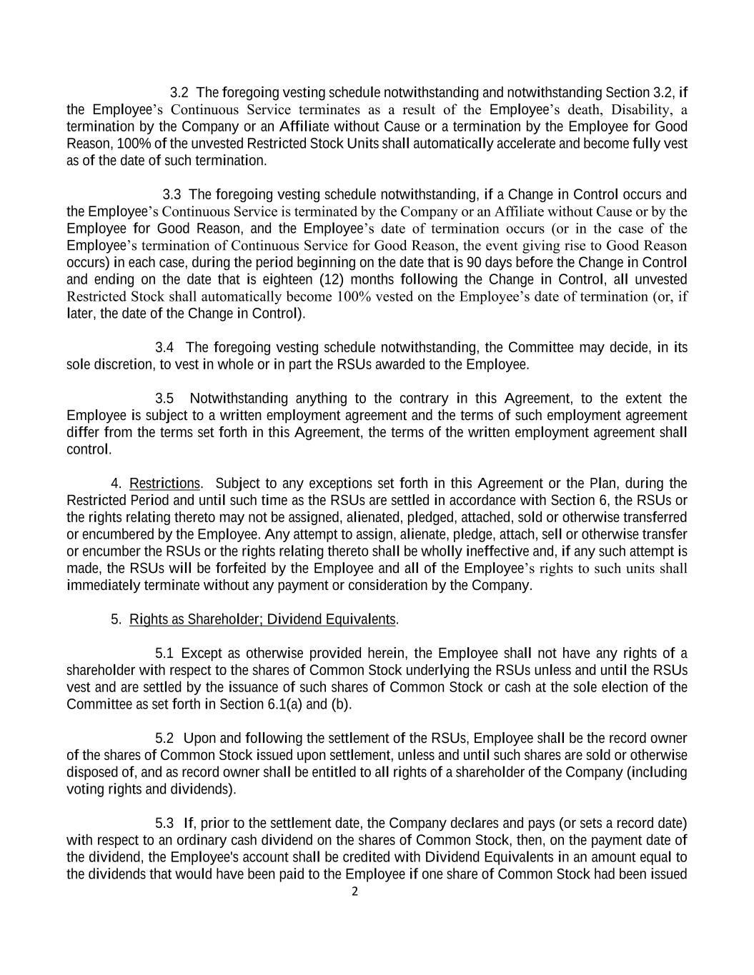 2 3.2 The foregoing vesting schedule notwithstanding and notwithstanding Section 3.2, if the Employee’s Continuous Service terminates as a result of the Employee’s death, Disability, a termination by the Company or an Affiliate without Cause or a termination by the Employee for Good Reason, 100% of the unvested Restricted Stock Units shall automatically accelerate and become fully vest as of the date of such termination. 3.3 The foregoing vesting schedule notwithstanding, if a Change in Control occurs and the Employee’s Continuous Service is terminated by the Company or an Affiliate without Cause or by the Employee for Good Reason, and the Employee’s date of termination occurs (or in the case of the Employee’s termination of Continuous Service for Good Reason, the event giving rise to Good Reason occurs) in each case, during the period beginning on the date that is 90 days before the Change in Control and ending on the date that is eighteen (12) months following the Change in Control, all unvested Restricted Stock shall automatically become 100% vested on the Employee’s date of termination (or, if later, the date of the Change in Control). 3.4 The foregoing vesting schedule notwithstanding, the Committee may decide, in its sole discretion, to vest in whole or in part the RSUs awarded to the Employee. 3.5 Notwithstanding anything to the contrary in this Agreement, to the extent the Employee is subject to a written employment agreement and the terms of such employment agreement differ from the terms set forth in this Agreement, the terms of the written employment agreement shall control. 4. Restrictions. Subject to any exceptions set forth in this Agreement or the Plan, during the Restricted Period and until such time as the RSUs are settled in accordance with Section 6, the RSUs or the rights relating thereto may not be assigned, alienated, pledged, attached, sold or otherwise transferred or encumbered by the Employee. Any attempt to assign, alienate, pledge, attach, sell or otherwise transfer or encumber the RSUs or the rights relating thereto shall be wholly ineffective and, if any such attempt is made, the RSUs will be forfeited by the Employee and all of the Employee’s rights to such units shall immediately terminate without any payment or consideration by the Company. 5. Rights as Shareholder; Dividend Equivalents. 5.1 Except as otherwise provided herein, the Employee shall not have any rights of a shareholder with respect to the shares of Common Stock underlying the RSUs unless and until the RSUs vest and are settled by the issuance of such shares of Common Stock or cash at the sole election of the Committee as set forth in Section 6.1(a) and (b). 5.2 Upon and following the settlement of the RSUs, Employee shall be the record owner of the shares of Common Stock issued upon settlement, unless and until such shares are sold or otherwise disposed of, and as record owner shall be entitled to all rights of a shareholder of the Company (including voting rights and dividends). 5.3 If, prior to the settlement date, the Company declares and pays (or sets a record date) with respect to an ordinary cash dividend on the shares of Common Stock, then, on the payment date of the dividend, the Employee's account shall be credited with Dividend Equivalents in an amount equal to the dividends that would have been paid to the Employee if one share of Common Stock had been issued