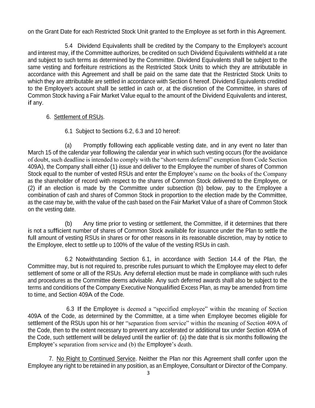 3 on the Grant Date for each Restricted Stock Unit granted to the Employee as set forth in this Agreement. 5.4 Dividend Equivalents shall be credited by the Company to the Employee's account and interest may, if the Committee authorizes, be credited on such Dividend Equivalents withheld at a rate and subject to such terms as determined by the Committee. Dividend Equivalents shall be subject to the same vesting and forfeiture restrictions as the Restricted Stock Units to which they are attributable in accordance with this Agreement and shall be paid on the same date that the Restricted Stock Units to which they are attributable are settled in accordance with Section 6 hereof. Dividend Equivalents credited to the Employee's account shall be settled in cash or, at the discretion of the Committee, in shares of Common Stock having a Fair Market Value equal to the amount of the Dividend Equivalents and interest, if any. 6. Settlement of RSUs. 6.1 Subject to Sections 6.2, 6.3 and 10 hereof: (a) Promptly following each applicable vesting date, and in any event no later than March 15 of the calendar year following the calendar year in which such vesting occurs (for the avoidance of doubt, such deadline is intended to comply with the “short-term deferral” exemption from Code Section 409A), the Company shall either (1) issue and deliver to the Employee the number of shares of Common Stock equal to the number of vested RSUs and enter the Employee’s name on the books of the Company as the shareholder of record with respect to the shares of Common Stock delivered to the Employee, or (2) if an election is made by the Committee under subsection (b) below, pay to the Employee a combination of cash and shares of Common Stock in proportion to the election made by the Committee, as the case may be, with the value of the cash based on the Fair Market Value of a share of Common Stock on the vesting date. (b) Any time prior to vesting or settlement, the Committee, if it determines that there is not a sufficient number of shares of Common Stock available for issuance under the Plan to settle the full amount of vesting RSUs in shares or for other reasons in its reasonable discretion, may by notice to the Employee, elect to settle up to 100% of the value of the vesting RSUs in cash. 6.2 Notwithstanding Section 6.1, in accordance with Section 14.4 of the Plan, the Committee may, but is not required to, prescribe rules pursuant to which the Employee may elect to defer settlement of some or all of the RSUs. Any deferral election must be made in compliance with such rules and procedures as the Committee deems advisable. Any such deferred awards shall also be subject to the terms and conditions of the Company Executive Nonqualified Excess Plan, as may be amended from time to time, and Section 409A of the Code. 6.3 If the Employee is deemed a “specified employee” within the meaning of Section 409A of the Code, as determined by the Committee, at a time when Employee becomes eligible for settlement of the RSUs upon his or her “separation from service” within the meaning of Section 409A of the Code, then to the extent necessary to prevent any accelerated or additional tax under Section 409A of the Code, such settlement will be delayed until the earlier of: (a) the date that is six months following the Employee’s separation from service and (b) the Employee’s death. 7. No Right to Continued Service. Neither the Plan nor this Agreement shall confer upon the Employee any right to be retained in any position, as an Employee, Consultant or Director of the Company.