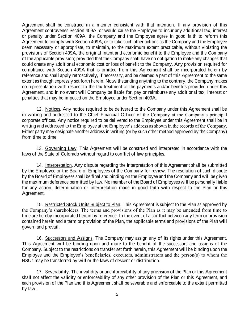 5 Agreement shall be construed in a manner consistent with that intention. If any provision of this Agreement contravenes Section 409A, or would cause the Employee to incur any additional tax, interest or penalty under Section 409A, the Company and the Employee agree in good faith to reform this Agreement to comply with Section 409A, or to take such other actions as the Company and the Employee deem necessary or appropriate, to maintain, to the maximum extent practicable, without violating the provisions of Section 409A, the original intent and economic benefit to the Employee and the Company of the applicable provision; provided that the Company shall have no obligation to make any changes that could create any additional economic cost or loss of benefit to the Company. Any provision required for compliance with Section 409A that is omitted from this Agreement shall be incorporated herein by reference and shall apply retroactively, if necessary, and be deemed a part of this Agreement to the same extent as though expressly set forth herein. Notwithstanding anything to the contrary, the Company makes no representation with respect to the tax treatment of the payments and/or benefits provided under this Agreement, and in no event will Company be liable for, pay or reimburse any additional tax, interest or penalties that may be imposed on the Employee under Section 409A. 12. Notices. Any notice required to be delivered to the Company under this Agreement shall be in writing and addressed to the Chief Financial Officer of the Company at the Company’s principal corporate offices. Any notice required to be delivered to the Employee under this Agreement shall be in writing and addressed to the Employee at the Employee’s address as shown in the records of the Company. Either party may designate another address in writing (or by such other method approved by the Company) from time to time. 13. Governing Law. This Agreement will be construed and interpreted in accordance with the laws of the State of Colorado without regard to conflict of law principles. 14. Interpretation. Any dispute regarding the interpretation of this Agreement shall be submitted by the Employee or the Board of Employees of the Company for review. The resolution of such dispute by the Board of Employees shall be final and binding on the Employee and the Company and will be given the maximum deference permitted by law. No member of the Board of Employees will be personally liable for any action, determination or interpretation made in good faith with respect to the Plan or this Agreement. 15. Restricted Stock Units Subject to Plan. This Agreement is subject to the Plan as approved by the Company’s shareholders. The terms and provisions of the Plan as it may be amended from time to time are hereby incorporated herein by reference. In the event of a conflict between any term or provision contained herein and a term or provision of the Plan, the applicable terms and provisions of the Plan will govern and prevail. 16. Successors and Assigns. The Company may assign any of its rights under this Agreement. This Agreement will be binding upon and inure to the benefit of the successors and assigns of the Company. Subject to the restrictions on transfer set forth herein, this Agreement will be binding upon the Employee and the Employee’s beneficiaries, executors, administrators and the person(s) to whom the RSUs may be transferred by will or the laws of descent or distribution. 17. Severability. The invalidity or unenforceability of any provision of the Plan or this Agreement shall not affect the validity or enforceability of any other provision of the Plan or this Agreement, and each provision of the Plan and this Agreement shall be severable and enforceable to the extent permitted by law.