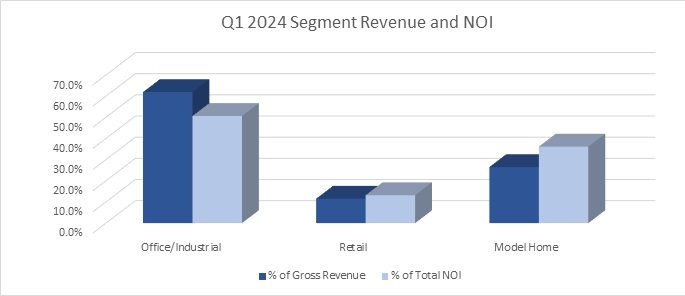 | ● | Total revenues were approximately $4.8 million for the three months ended March 31, 2024, compared to approximately $4.1 million for the same period in 2023. As of March 31, 2024, we had approximately $135.3 million in net real estate assets including 88 model homes, compared to approximately $133.9 million in net real estate assets including 98 model homes at March 31, 2023. The average number of model homes held during the three months ended March 31, 2024 and 2023 was 99 and 95, respectively. The change in revenue is directly related to the average real estate assets held during the period, new commercial real estate leases, and model home transaction fees earned by the Company during the current period. | |