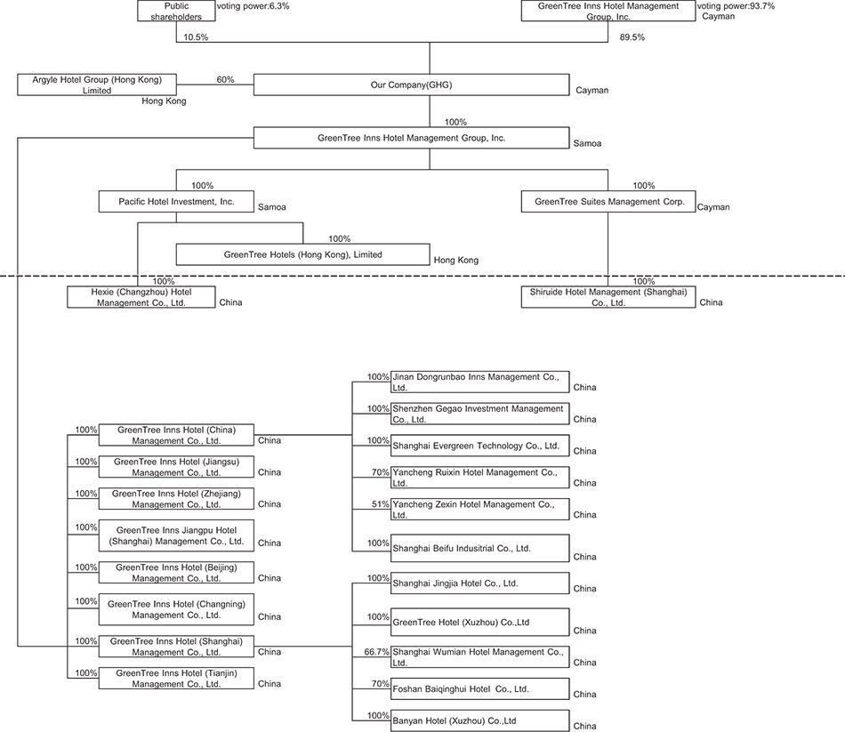 Public shareholders voting power:6.3% GreenTree Inns Hotel Management Group, Inc. voting power:93.7% Cayman 10.6% 89.4% Argyle Hotel Group (Hong Kong) Limited 60% Our Company(GHG) Cayman Hong Kong 100% GreenTree Inns Hotel Management Group, Inc. Samoa 100% 100% Pacific Hotel Investment, Inc. GreenTree Suites Management Corp. Samoa Cayman 100% GreenTree Hotels (Hong Kong), Limited Hong Kong 100% 100% Hexie (Changzhou) Hotel Management Co., Ltd. Shiruide Hotel Management (Shanghai) China Co., Ltd. China 100% Jinan Dongrunbao Inns Management Co., Ltd. China 100% Shenzhen Gegao Investment Management Co., Ltd. China 100% GreenTree Inns Hotel (China) Management Co., Ltd. China 100% Shanghai Evergreen Technology Co., Ltd. China 100% GreenTree Inns Hotel (Jiangsu) Management Co., Ltd. China 70% Yancheng Ruixin Hotel Management Co., Ltd. China 100% GreenTree Inns Hotel (Zhejiang) Management Co., Ltd. China 51% Yancheng Zexin Hotel Management Co., Ltd. China 100% GreenTree Inns Jiangpu Hotel (Shanghai) Management Co., Ltd. China 100% Shanghai Beifu Indusitrial Co., Ltd. China 100% GreenTree Inns Hotel (Beijing) Management Co., Ltd. China 100% Shanghai Jingjia Hotel Co., Ltd. China 100% GreenTree Inns Hotel (Changning) Management Co., Ltd. China 100% GreenTree Hotel (Xuzhou) Co.,Ltd China 100% GreenTree Inns Hotel (Shanghai) Management Co., Ltd. China 66.7% Shanghai Wumian Hotel Management Co., Ltd. China 100% GreenTree Inns Hotel (Tianjin) Management Co., Ltd. China 70% Foshan Baiqinghui Hotel Co., Ltd. China 100% Banyan Hotel (Xuzhou) Co.,Ltd China |