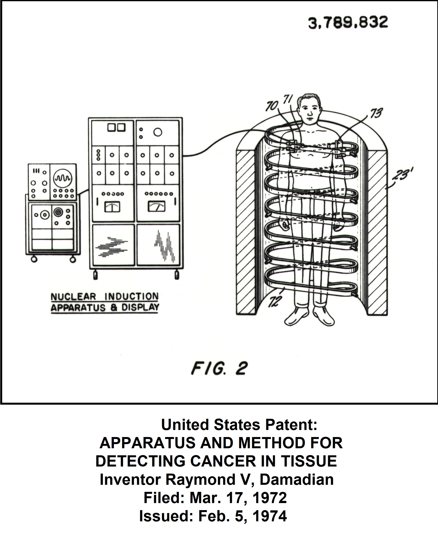 The patent abstract says: “An apparatus and method in which a tissue sample positioned in a nuclear induction apparatus (magnet) whereby selected nuclei are energized from their equilibrium states to higher energy states through nuclear magnetic resonance (NMR). By measuring the spin-lattice relaxation time (T1) and the spin-spin relaxation time (T2) as the energized nuclei return to their equilibrium states, and then comparing these relaxation times with their respective values for known normal and malignant tissue, an indication of the presence and degree of malignancy of cancerous tissue can be obtained.”