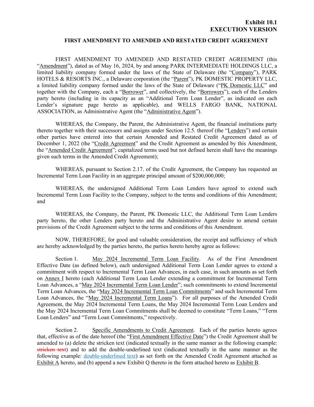 Exhibit 10.1 EXECUTION VERSION FIRST AMENDMENT TO AMENDED AND RESTATED CREDIT AGREEMENT FIRST AMENDMENT TO AMENDED AND RESTATED CREDIT AGREEMENT (this “Amendment”), dated as of May 16, 2024, by and among PARK INTERMEDIATE HOLDINGS LLC, a limited liability company formed under the laws of the State of Delaware (the “Company”), PARK HOTELS & RESORTS INC., a Delaware corporation (the “Parent”), PK DOMESTIC PROPERTY LLC, a limited liability company formed under the laws of the State of Delaware (“PK Domestic LLC” and together with the Company, each a “Borrower”, and collectively, the “Borrowers”), each of the Lenders party hereto (including in its capacity as an “Additional Term Loan Lender”, as indicated on each Lender’s signature page hereto as applicable), and WELLS FARGO BANK, NATIONAL ASSOCIATION, as Administrative Agent (the “Administrative Agent”). WHEREAS, the Company, the Parent, the Administrative Agent, the financial institutions party thereto together with their successors and assigns under Section 12.5. thereof (the “Lenders”) and certain other parties have entered into that certain Amended and Restated Credit Agreement dated as of December 1, 2022 (the “Credit Agreement” and the Credit Agreement as amended by this Amendment, the “Amended Credit Agreement”; capitalized terms used but not defined herein shall have the meanings given such terms in the Amended Credit Agreement); WHEREAS, pursuant to Section 2.17. of the Credit Agreement, the Company has requested an Incremental Term Loan Facility in an aggregate principal amount of $200,000,000; WHEREAS, the undersigned Additional Term Loan Lenders have agreed to extend such Incremental Term Loan Facility to the Company, subject to the terms and conditions of this Amendment; and WHEREAS, the Company, the Parent, PK Domestic LLC, the Additional Term Loan Lenders party hereto, the other Lenders party hereto and the Administrative Agent desire to amend certain provisions of the Credit Agreement subject to the terms and conditions of this Amendment. NOW, THEREFORE, for good and valuable consideration, the receipt and sufficiency of which are hereby acknowledged by the parties hereto, the parties hereto hereby agree as follows: Section 1. May 2024 Incremental Term Loan Facility. As of the First Amendment Effective Date (as defined below), each undersigned Additional Term Loan Lender agrees to extend a commitment with respect to Incremental Term Loan Advances, in each case, in such amounts as set forth on Annex I hereto (each Additional Term Loan Lender extending a commitment for Incremental Term Loan Advances, a “May 2024 Incremental Term Loan Lender”; such commitments to extend Incremental Term Loan Advances, the “May 2024 Incremental Term Loan Commitments” and such Incremental Term Loan Advances, the “May 2024 Incremental Term Loans”). For all purposes of the Amended Credit Agreement, the May 2024 Incremental Term Loans, the May 2024 Incremental Term Loan Lenders and the May 2024 Incremental Term Loan Commitments shall be deemed to constitute “Term Loans,” “Term Loan Lenders” and “Term Loan Commitments,” respectively. Section 2. Specific Amendments to Credit Agreement. Each of the parties hereto agrees that, effective as of the date hereof (the “First Amendment Effective Date”) the Credit Agreement shall be amended to (a) delete the stricken text (indicated textually in the same manner as the following example: stricken text) and to add the double-underlined text (indicated textually in the same manner as the following example: double-underlined text) as set forth on the Amended Credit Agreement attached as Exhibit A hereto, and (b) append a new Exhibit Q thereto in the form attached hereto as Exhibit B.