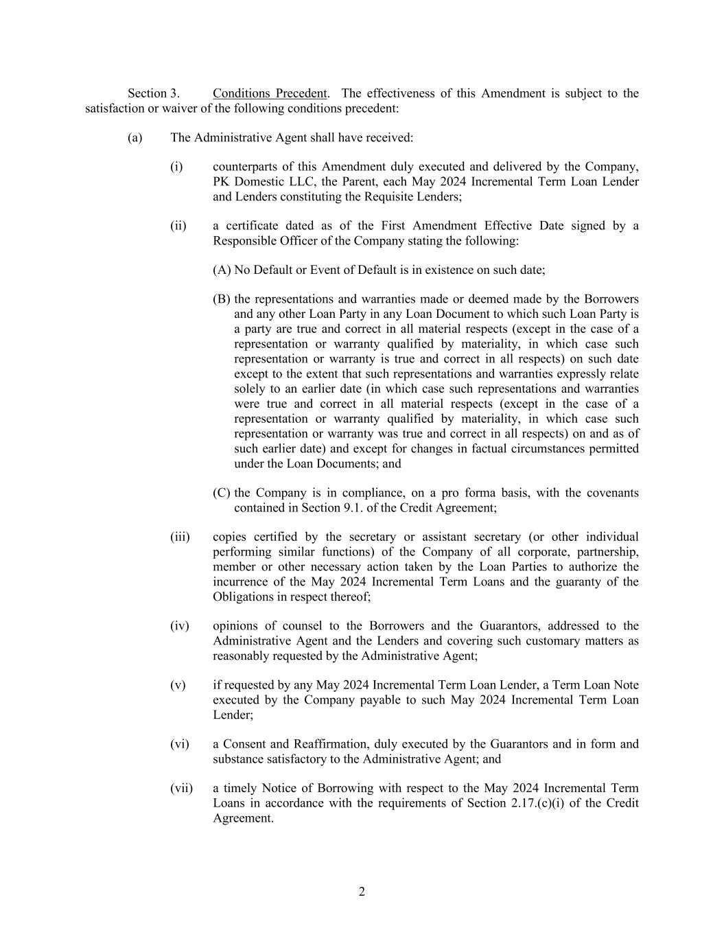 2 Section 3. Conditions Precedent. The effectiveness of this Amendment is subject to the satisfaction or waiver of the following conditions precedent: (a) The Administrative Agent shall have received: (i) counterparts of this Amendment duly executed and delivered by the Company, PK Domestic LLC, the Parent, each May 2024 Incremental Term Loan Lender and Lenders constituting the Requisite Lenders; (ii) a certificate dated as of the First Amendment Effective Date signed by a Responsible Officer of the Company stating the following: (A) No Default or Event of Default is in existence on such date; (B) the representations and warranties made or deemed made by the Borrowers and any other Loan Party in any Loan Document to which such Loan Party is a party are true and correct in all material respects (except in the case of a representation or warranty qualified by materiality, in which case such representation or warranty is true and correct in all respects) on such date except to the extent that such representations and warranties expressly relate solely to an earlier date (in which case such representations and warranties were true and correct in all material respects (except in the case of a representation or warranty qualified by materiality, in which case such representation or warranty was true and correct in all respects) on and as of such earlier date) and except for changes in factual circumstances permitted under the Loan Documents; and (C) the Company is in compliance, on a pro forma basis, with the covenants contained in Section 9.1. of the Credit Agreement; (iii) copies certified by the secretary or assistant secretary (or other individual performing similar functions) of the Company of all corporate, partnership, member or other necessary action taken by the Loan Parties to authorize the incurrence of the May 2024 Incremental Term Loans and the guaranty of the Obligations in respect thereof; (iv) opinions of counsel to the Borrowers and the Guarantors, addressed to the Administrative Agent and the Lenders and covering such customary matters as reasonably requested by the Administrative Agent; (v) if requested by any May 2024 Incremental Term Loan Lender, a Term Loan Note executed by the Company payable to such May 2024 Incremental Term Loan Lender; (vi) a Consent and Reaffirmation, duly executed by the Guarantors and in form and substance satisfactory to the Administrative Agent; and (vii) a timely Notice of Borrowing with respect to the May 2024 Incremental Term Loans in accordance with the requirements of Section 2.17.(c)(i) of the Credit Agreement.