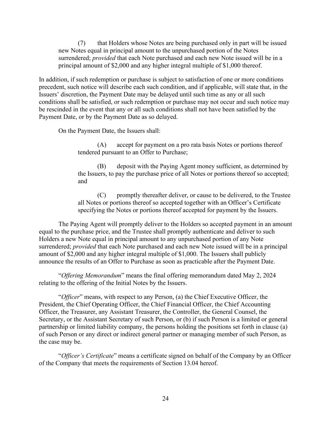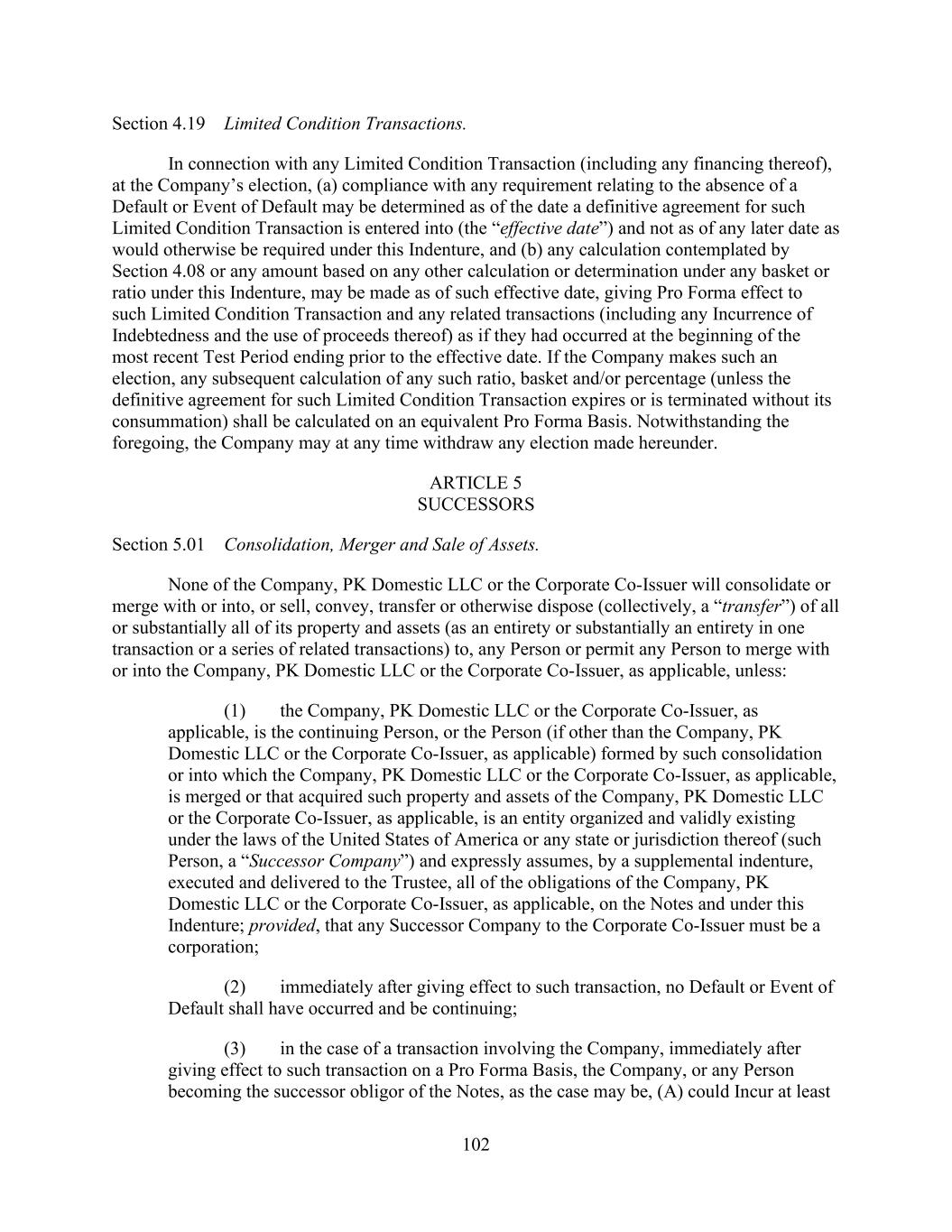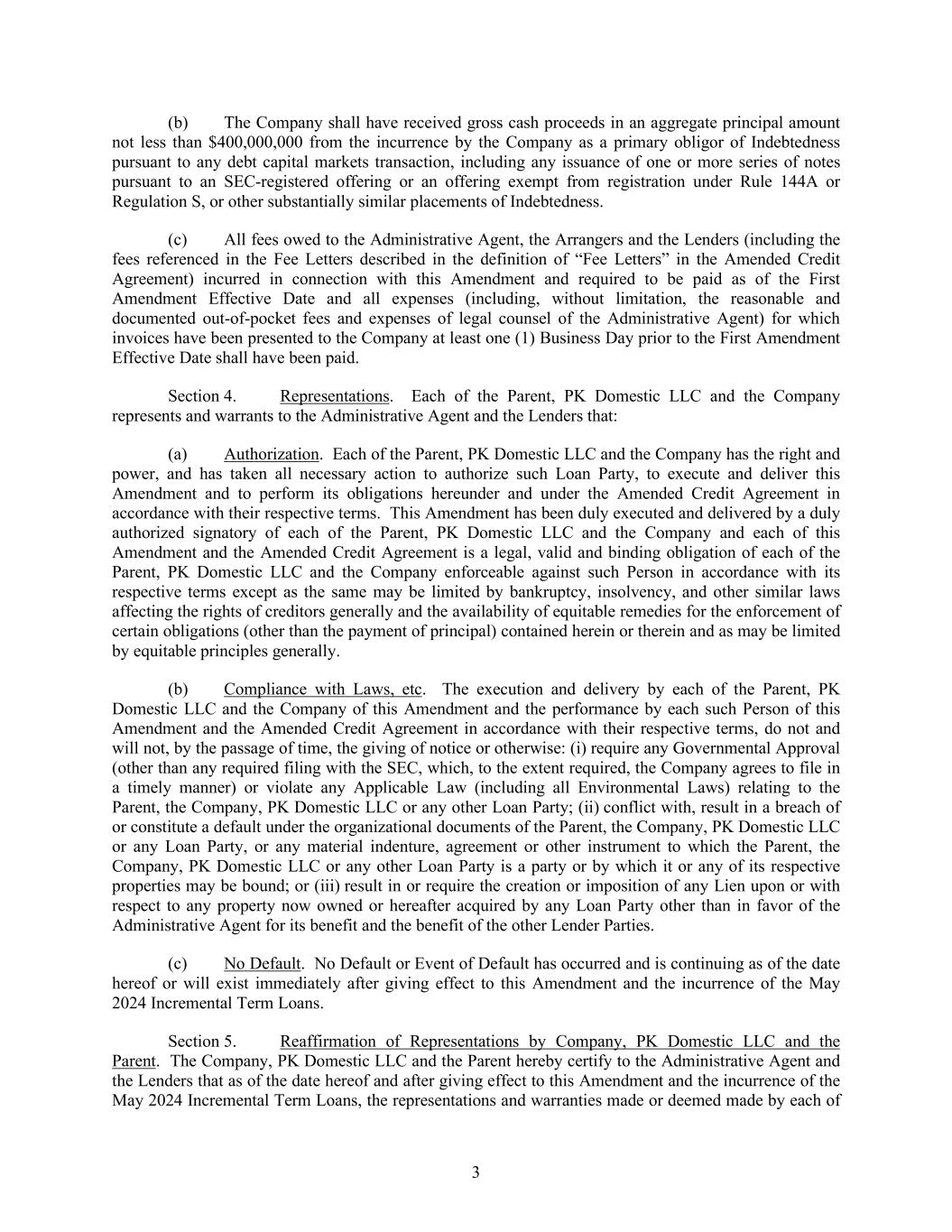 3 (b) The Company shall have received gross cash proceeds in an aggregate principal amount not less than $400,000,000 from the incurrence by the Company as a primary obligor of Indebtedness pursuant to any debt capital markets transaction, including any issuance of one or more series of notes pursuant to an SEC-registered offering or an offering exempt from registration under Rule 144A or Regulation S, or other substantially similar placements of Indebtedness. (c) All fees owed to the Administrative Agent, the Arrangers and the Lenders (including the fees referenced in the Fee Letters described in the definition of “Fee Letters” in the Amended Credit Agreement) incurred in connection with this Amendment and required to be paid as of the First Amendment Effective Date and all expenses (including, without limitation, the reasonable and documented out-of-pocket fees and expenses of legal counsel of the Administrative Agent) for which invoices have been presented to the Company at least one (1) Business Day prior to the First Amendment Effective Date shall have been paid. Section 4. Representations. Each of the Parent, PK Domestic LLC and the Company represents and warrants to the Administrative Agent and the Lenders that: (a) Authorization. Each of the Parent, PK Domestic LLC and the Company has the right and power, and has taken all necessary action to authorize such Loan Party, to execute and deliver this Amendment and to perform its obligations hereunder and under the Amended Credit Agreement in accordance with their respective terms. This Amendment has been duly executed and delivered by a duly authorized signatory of each of the Parent, PK Domestic LLC and the Company and each of this Amendment and the Amended Credit Agreement is a legal, valid and binding obligation of each of the Parent, PK Domestic LLC and the Company enforceable against such Person in accordance with its respective terms except as the same may be limited by bankruptcy, insolvency, and other similar laws affecting the rights of creditors generally and the availability of equitable remedies for the enforcement of certain obligations (other than the payment of principal) contained herein or therein and as may be limited by equitable principles generally. (b) Compliance with Laws, etc. The execution and delivery by each of the Parent, PK Domestic LLC and the Company of this Amendment and the performance by each such Person of this Amendment and the Amended Credit Agreement in accordance with their respective terms, do not and will not, by the passage of time, the giving of notice or otherwise: (i) require any Governmental Approval (other than any required filing with the SEC, which, to the extent required, the Company agrees to file in a timely manner) or violate any Applicable Law (including all Environmental Laws) relating to the Parent, the Company, PK Domestic LLC or any other Loan Party; (ii) conflict with, result in a breach of or constitute a default under the organizational documents of the Parent, the Company, PK Domestic LLC or any Loan Party, or any material indenture, agreement or other instrument to which the Parent, the Company, PK Domestic LLC or any other Loan Party is a party or by which it or any of its respective properties may be bound; or (iii) result in or require the creation or imposition of any Lien upon or with respect to any property now owned or hereafter acquired by any Loan Party other than in favor of the Administrative Agent for its benefit and the benefit of the other Lender Parties. (c) No Default. No Default or Event of Default has occurred and is continuing as of the date hereof or will exist immediately after giving effect to this Amendment and the incurrence of the May 2024 Incremental Term Loans. Section 5. Reaffirmation of Representations by Company, PK Domestic LLC and the Parent. The Company, PK Domestic LLC and the Parent hereby certify to the Administrative Agent and the Lenders that as of the date hereof and after giving effect to this Amendment and the incurrence of the May 2024 Incremental Term Loans, the representations and warranties made or deemed made by each of