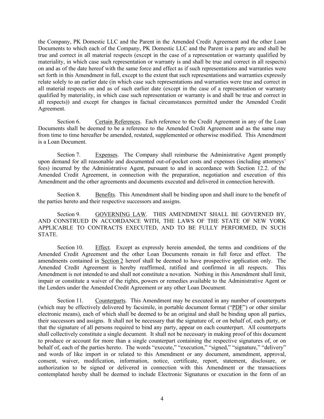 4 the Company, PK Domestic LLC and the Parent in the Amended Credit Agreement and the other Loan Documents to which each of the Company, PK Domestic LLC and the Parent is a party are and shall be true and correct in all material respects (except in the case of a representation or warranty qualified by materiality, in which case such representation or warranty is and shall be true and correct in all respects) on and as of the date hereof with the same force and effect as if such representations and warranties were set forth in this Amendment in full, except to the extent that such representations and warranties expressly relate solely to an earlier date (in which case such representations and warranties were true and correct in all material respects on and as of such earlier date (except in the case of a representation or warranty qualified by materiality, in which case such representation or warranty is and shall be true and correct in all respects)) and except for changes in factual circumstances permitted under the Amended Credit Agreement. Section 6. Certain References. Each reference to the Credit Agreement in any of the Loan Documents shall be deemed to be a reference to the Amended Credit Agreement and as the same may from time to time hereafter be amended, restated, supplemented or otherwise modified. This Amendment is a Loan Document. Section 7. Expenses. The Company shall reimburse the Administrative Agent promptly upon demand for all reasonable and documented out-of-pocket costs and expenses (including attorneys’ fees) incurred by the Administrative Agent, pursuant to and in accordance with Section 12.2. of the Amended Credit Agreement, in connection with the preparation, negotiation and execution of this Amendment and the other agreements and documents executed and delivered in connection herewith. Section 8. Benefits. This Amendment shall be binding upon and shall inure to the benefit of the parties hereto and their respective successors and assigns. Section 9. GOVERNING LAW. THIS AMENDMENT SHALL BE GOVERNED BY, AND CONSTRUED IN ACCORDANCE WITH, THE LAWS OF THE STATE OF NEW YORK APPLICABLE TO CONTRACTS EXECUTED, AND TO BE FULLY PERFORMED, IN SUCH STATE. Section 10. Effect. Except as expressly herein amended, the terms and conditions of the Amended Credit Agreement and the other Loan Documents remain in full force and effect. The amendments contained in Section 2 hereof shall be deemed to have prospective application only. The Amended Credit Agreement is hereby reaffirmed, ratified and confirmed in all respects. This Amendment is not intended to and shall not constitute a novation. Nothing in this Amendment shall limit, impair or constitute a waiver of the rights, powers or remedies available to the Administrative Agent or the Lenders under the Amended Credit Agreement or any other Loan Document. Section 11. Counterparts. This Amendment may be executed in any number of counterparts (which may be effectively delivered by facsimile, in portable document format (“PDF”) or other similar electronic means), each of which shall be deemed to be an original and shall be binding upon all parties, their successors and assigns. It shall not be necessary that the signature of, or on behalf of, each party, or that the signature of all persons required to bind any party, appear on each counterpart. All counterparts shall collectively constitute a single document. It shall not be necessary in making proof of this document to produce or account for more than a single counterpart containing the respective signatures of, or on behalf of, each of the parties hereto. The words “execute,” “execution,” “signed,” “signature,” “delivery” and words of like import in or related to this Amendment or any document, amendment, approval, consent, waiver, modification, information, notice, certificate, report, statement, disclosure, or authorization to be signed or delivered in connection with this Amendment or the transactions contemplated hereby shall be deemed to include Electronic Signatures or execution in the form of an