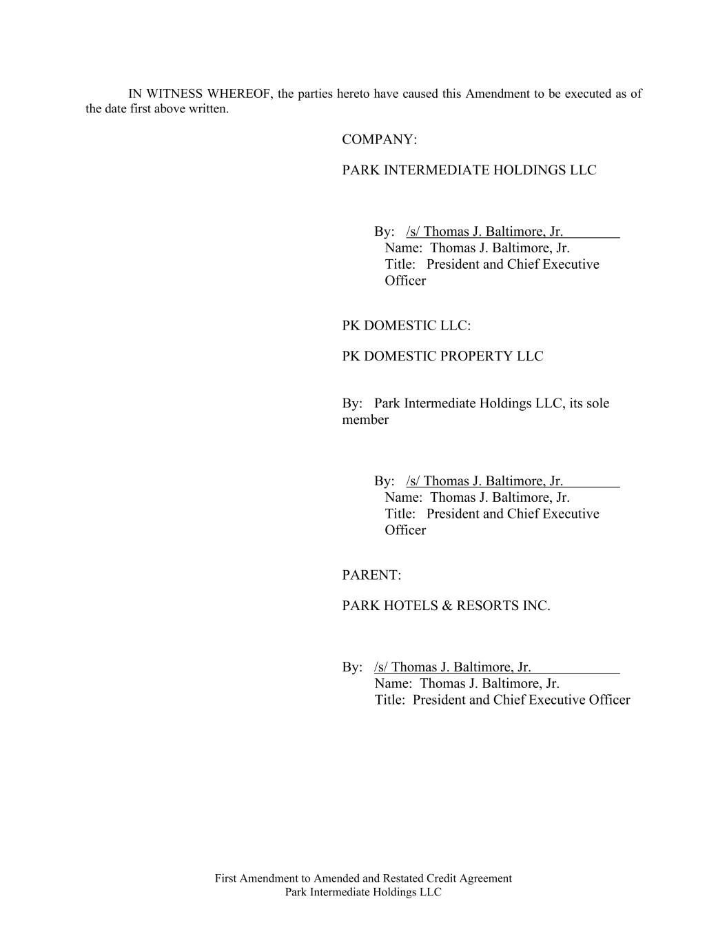 First Amendment to Amended and Restated Credit Agreement Park Intermediate Holdings LLC IN WITNESS WHEREOF, the parties hereto have caused this Amendment to be executed as of the date first above written. COMPANY: PARK INTERMEDIATE HOLDINGS LLC By: /s/ Thomas J. Baltimore, Jr. Name: Thomas J. Baltimore, Jr. Title: President and Chief Executive Officer PK DOMESTIC LLC: PK DOMESTIC PROPERTY LLC By: Park Intermediate Holdings LLC, its sole member By: /s/ Thomas J. Baltimore, Jr. Name: Thomas J. Baltimore, Jr. Title: President and Chief Executive Officer PARENT: PARK HOTELS & RESORTS INC. By: /s/ Thomas J. Baltimore, Jr. Name: Thomas J. Baltimore, Jr. Title: President and Chief Executive Officer