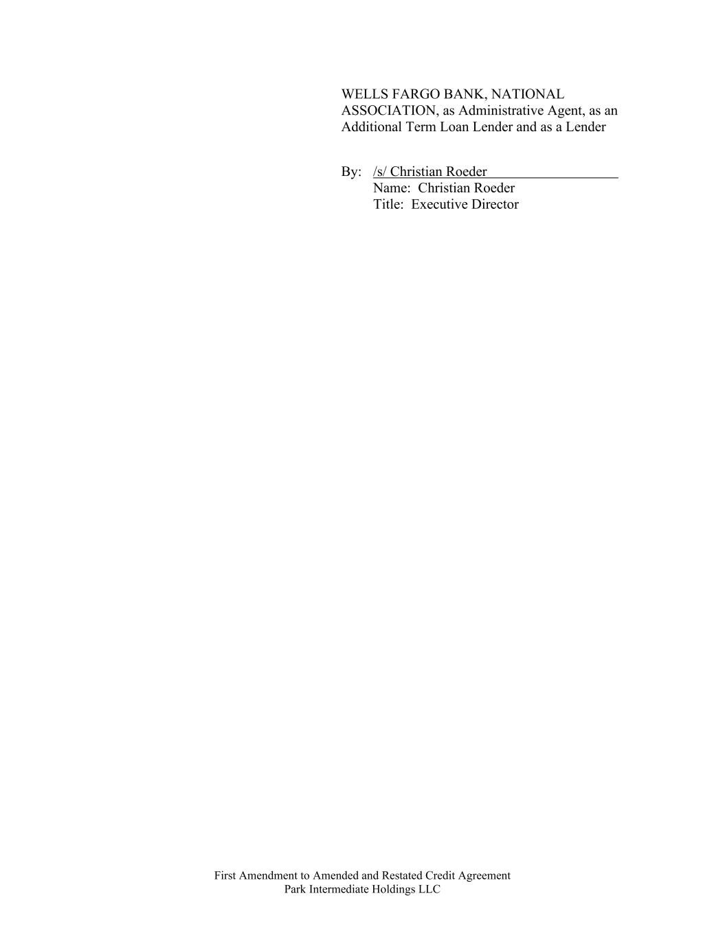 First Amendment to Amended and Restated Credit Agreement Park Intermediate Holdings LLC WELLS FARGO BANK, NATIONAL ASSOCIATION, as Administrative Agent, as an Additional Term Loan Lender and as a Lender By: /s/ Christian Roeder Name: Christian Roeder Title: Executive Director