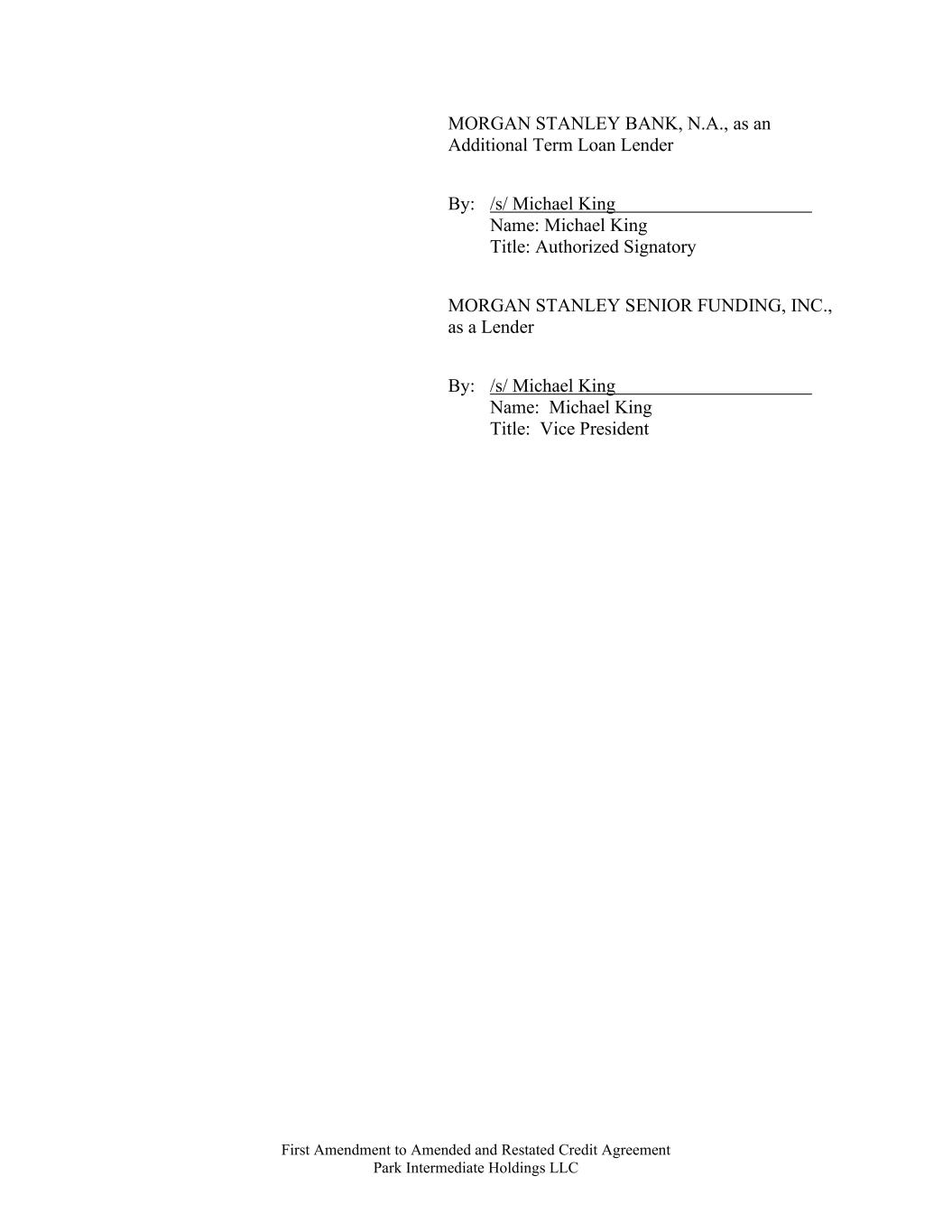 First Amendment to Amended and Restated Credit Agreement Park Intermediate Holdings LLC MORGAN STANLEY BANK, N.A., as an Additional Term Loan Lender By: /s/ Michael King Name: Michael King Title: Authorized Signatory MORGAN STANLEY SENIOR FUNDING, INC., as a Lender By: /s/ Michael King Name: Michael King Title: Vice President