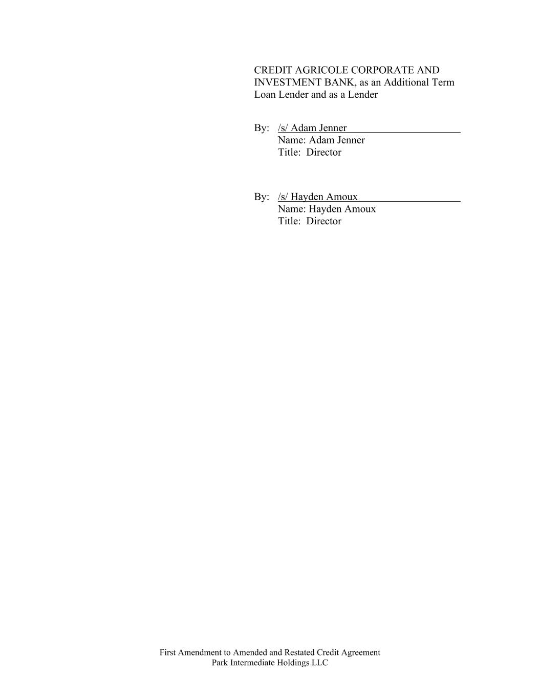 First Amendment to Amended and Restated Credit Agreement Park Intermediate Holdings LLC CREDIT AGRICOLE CORPORATE AND INVESTMENT BANK, as an Additional Term Loan Lender and as a Lender By: /s/ Adam Jenner Name: Adam Jenner Title: Director By: /s/ Hayden Amoux Name: Hayden Amoux Title: Director