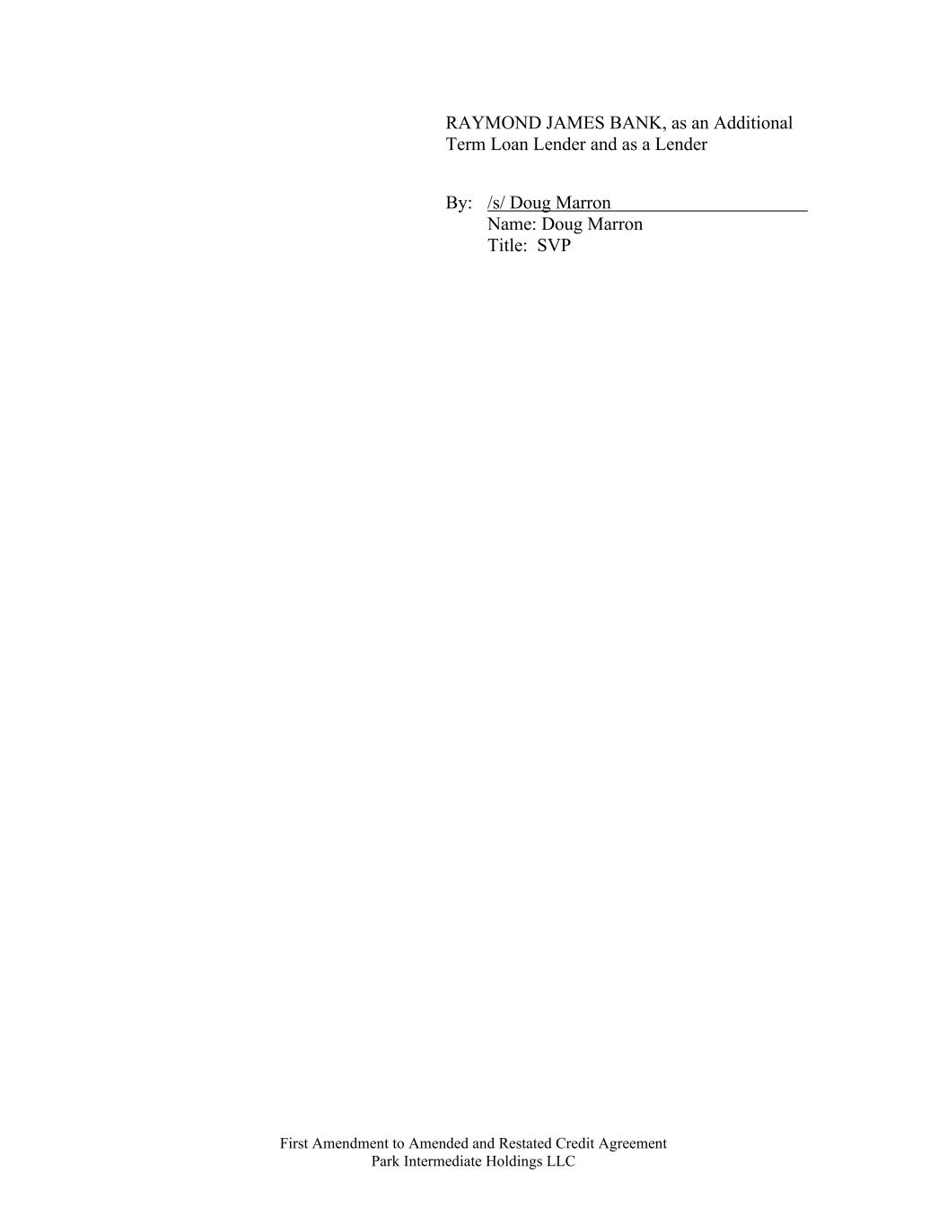 First Amendment to Amended and Restated Credit Agreement Park Intermediate Holdings LLC RAYMOND JAMES BANK, as an Additional Term Loan Lender and as a Lender By: /s/ Doug Marron Name: Doug Marron Title: SVP