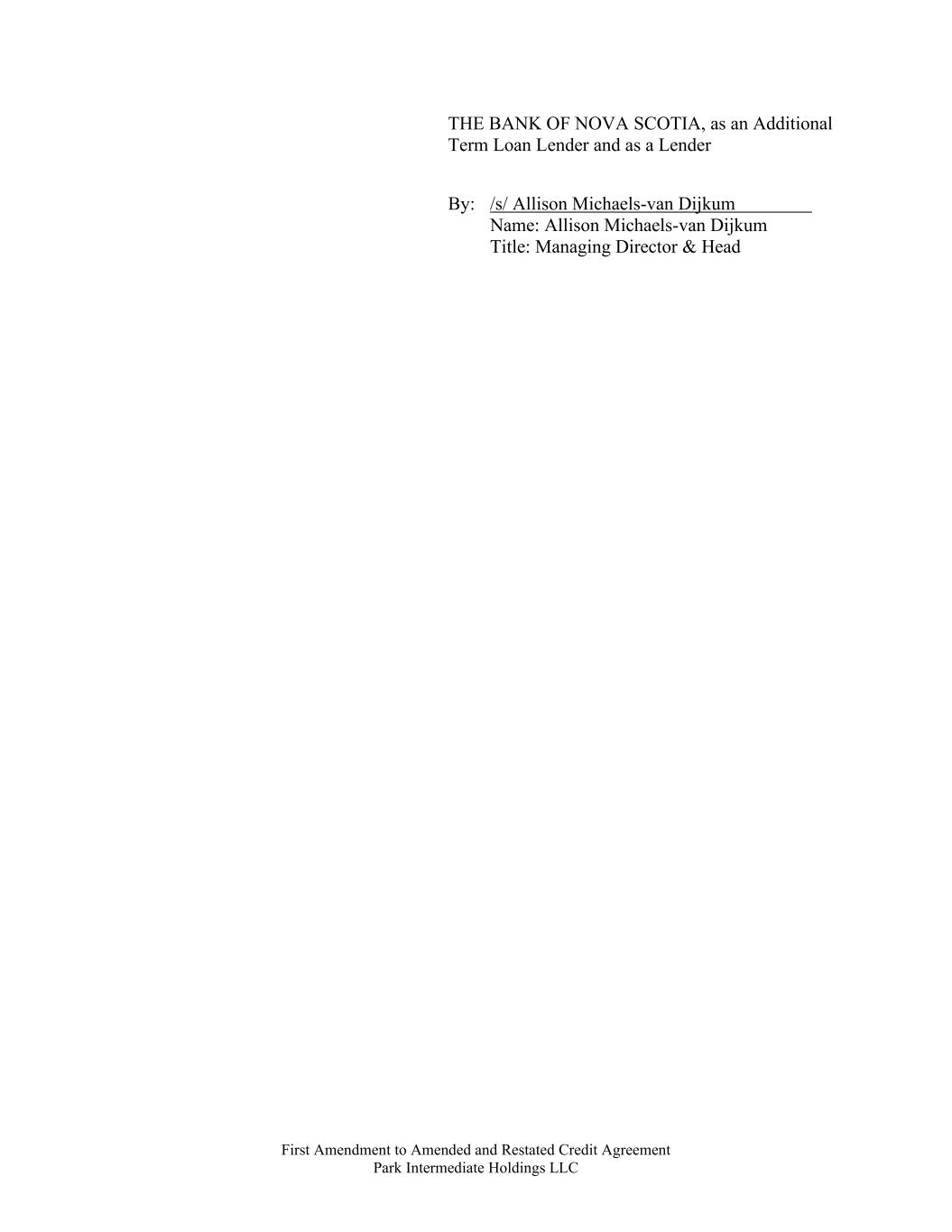 First Amendment to Amended and Restated Credit Agreement Park Intermediate Holdings LLC THE BANK OF NOVA SCOTIA, as an Additional Term Loan Lender and as a Lender By: /s/ Allison Michaels-van Dijkum Name: Allison Michaels-van Dijkum Title: Managing Director & Head