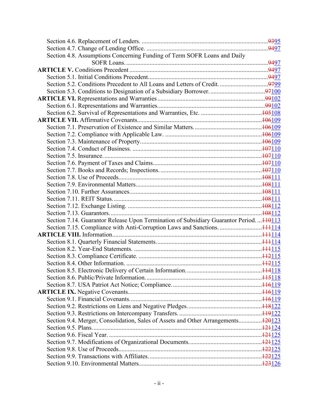 - ii - Section 4.6. Replacement of Lenders. .................................................................................9395 Section 4.7. Change of Lending Office. ..............................................................................9497 Section 4.8. Assumptions Concerning Funding of Term SOFR Loans and Daily SOFR Loans. ...........................................................................................9497 ARTICLE V. Conditions Precedent .........................................................................................9497 Section 5.1. Initial Conditions Precedent. ............................................................................9497 Section 5.2. Conditions Precedent to All Loans and Letters of Credit. ...............................9799 Section 5.3. Conditions to Designation of a Subsidiary Borrower. ...................................97100 ARTICLE VI. Representations and Warranties .....................................................................99102 Section 6.1. Representations and Warranties. ....................................................................99102 Section 6.2. Survival of Representations and Warranties, Etc. .......................................105108 ARTICLE VII. Affirmative Covenants................................................................................106109 Section 7.1. Preservation of Existence and Similar Matters. ...........................................106109 Section 7.2. Compliance with Applicable Law. ..............................................................106109 Section 7.3. Maintenance of Property. .............................................................................106109 Section 7.4. Conduct of Business. ...................................................................................107110 Section 7.5. Insurance. .....................................................................................................107110 Section 7.6. Payment of Taxes and Claims......................................................................107110 Section 7.7. Books and Records; Inspections. .................................................................107110 Section 7.8. Use of Proceeds............................................................................................108111 Section 7.9. Environmental Matters.................................................................................108111 Section 7.10. Further Assurances. ....................................................................................108111 Section 7.11. REIT Status. ...............................................................................................108111 Section 7.12. Exchange Listing. ......................................................................................108112 Section 7.13. Guarantors. .................................................................................................108112 Section 7.14. Guarantor Release Upon Termination of Subsidiary Guarantor Period. ...110113 Section 7.15. Compliance with Anti-Corruption Laws and Sanctions. ...........................111114 ARTICLE VIII. Information ................................................................................................111114 Section 8.1. Quarterly Financial Statements. ...................................................................111114 Section 8.2. Year-End Statements. ..................................................................................111115 Section 8.3. Compliance Certificate. ...............................................................................112115 Section 8.4. Other Information. .......................................................................................112115 Section 8.5. Electronic Delivery of Certain Information. ................................................114118 Section 8.6. Public/Private Information. ..........................................................................115118 Section 8.7. USA Patriot Act Notice; Compliance. .........................................................116119 ARTICLE IX. Negative Covenants......................................................................................116119 Section 9.1. Financial Covenants. ....................................................................................116119 Section 9.2. Restrictions on Liens and Negative Pledges. ...............................................118122 Section 9.3. Restrictions on Intercompany Transfers. .....................................................119122 Section 9.4. Merger, Consolidation, Sales of Assets and Other Arrangements...............120123 Section 9.5. Plans. ............................................................................................................121124 Section 9.6. Fiscal Year. ..................................................................................................121125 Section 9.7. Modifications of Organizational Documents. ..............................................121125 Section 9.8. Use of Proceeds............................................................................................122125 Section 9.9. Transactions with Affiliates. ........................................................................122125 Section 9.10. Environmental Matters. ..............................................................................123126