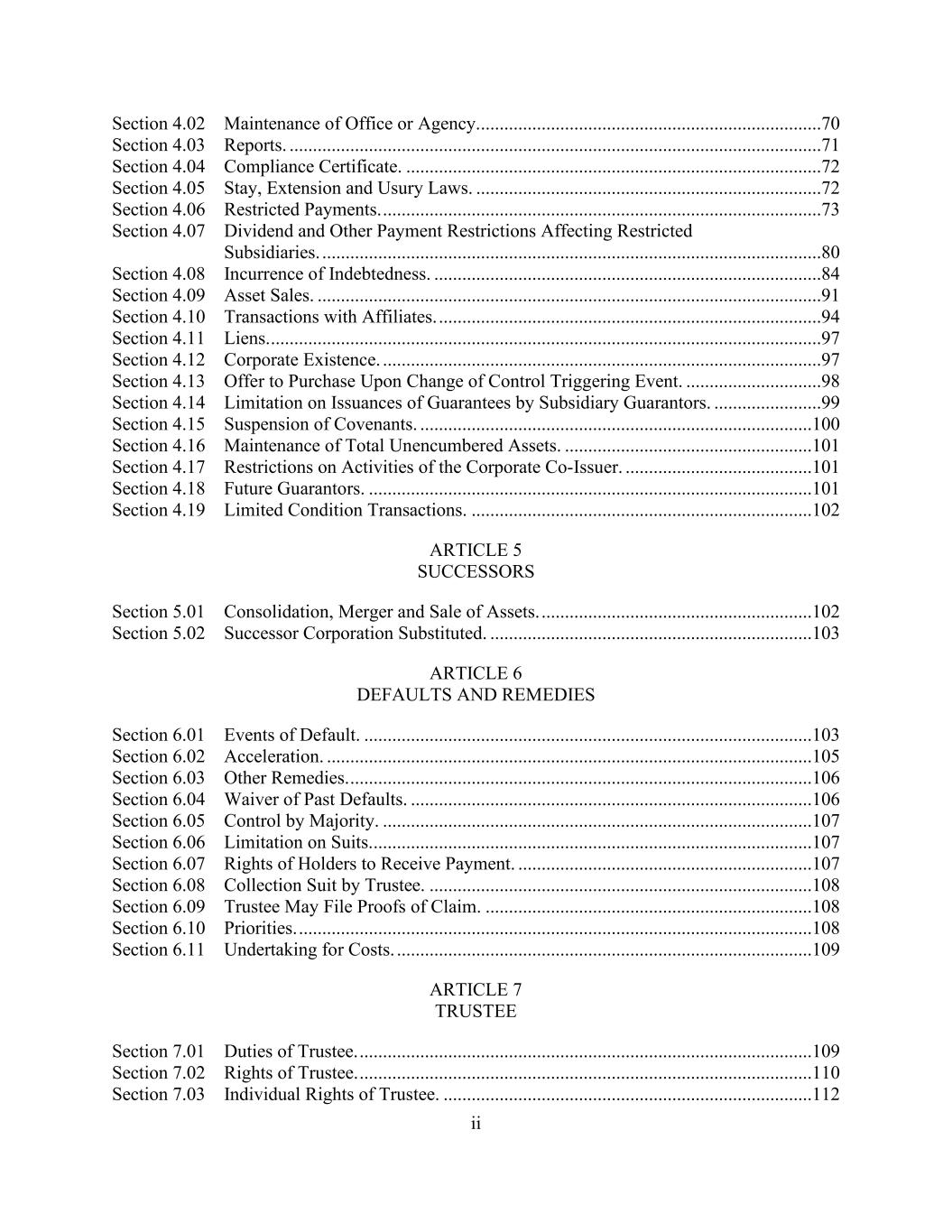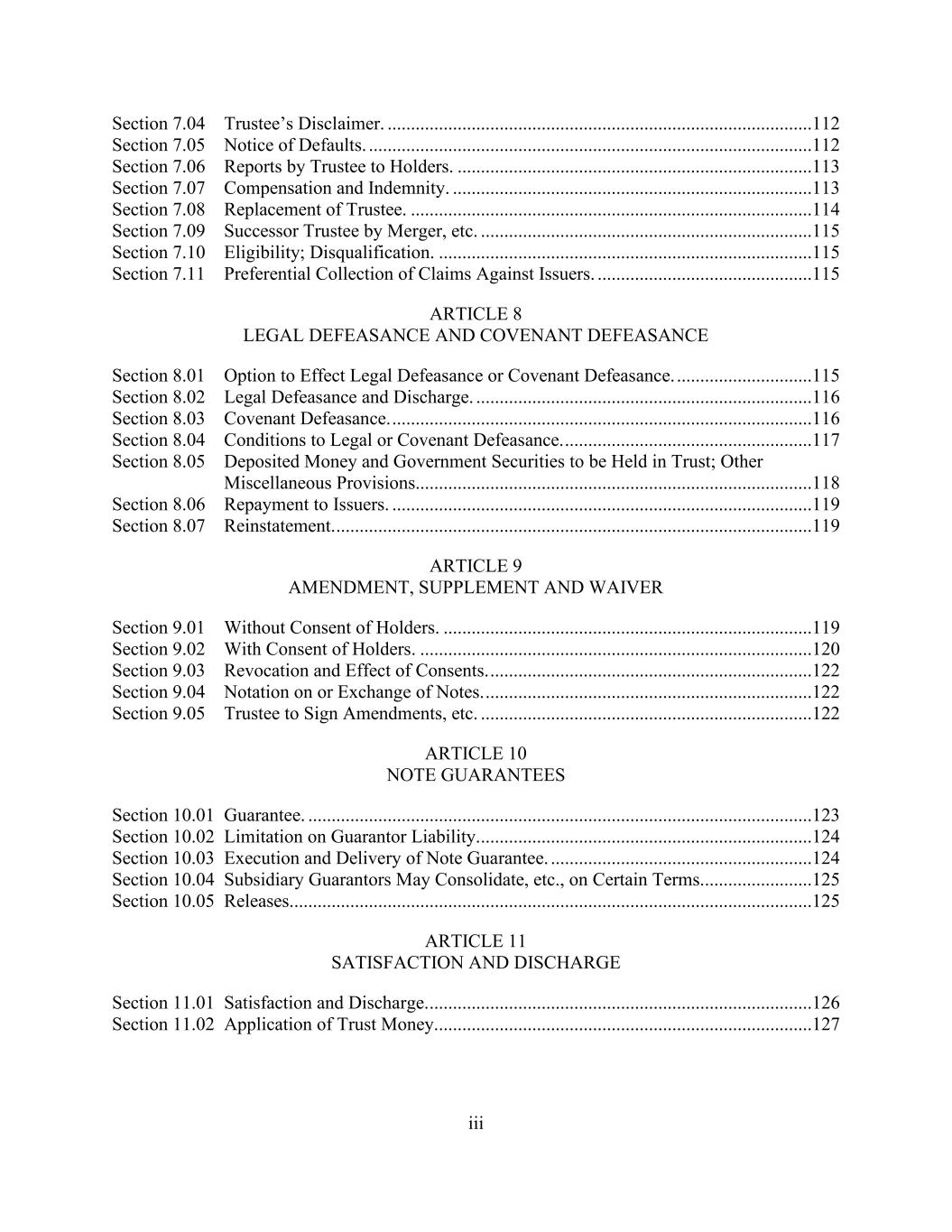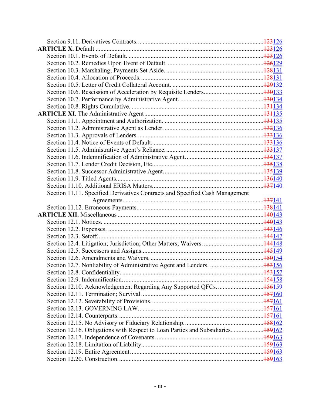- iii - Section 9.11. Derivatives Contracts. ................................................................................123126 ARTICLE X. Default ...........................................................................................................123126 Section 10.1. Events of Default. ......................................................................................123126 Section 10.2. Remedies Upon Event of Default. .............................................................126129 Section 10.3. Marshaling; Payments Set Aside. ..............................................................128131 Section 10.4. Allocation of Proceeds. ..............................................................................128131 Section 10.5. Letter of Credit Collateral Account. ..........................................................129132 Section 10.6. Rescission of Acceleration by Requisite Lenders. .....................................130133 Section 10.7. Performance by Administrative Agent. .....................................................130134 Section 10.8. Rights Cumulative. ....................................................................................131134 ARTICLE XI. The Administrative Agent ............................................................................131135 Section 11.1. Appointment and Authorization. ...............................................................131135 Section 11.2. Administrative Agent as Lender. ...............................................................132136 Section 11.3. Approvals of Lenders. ................................................................................133136 Section 11.4. Notice of Events of Default. ......................................................................133136 Section 11.5. Administrative Agent’s Reliance. ..............................................................133137 Section 11.6. Indemnification of Administrative Agent. .................................................134137 Section 11.7. Lender Credit Decision, Etc. ......................................................................135138 Section 11.8. Successor Administrative Agent. ...............................................................135139 Section 11.9. Titled Agents. .............................................................................................136140 Section 11.10. Additional ERISA Matters. ......................................................................137140 Section 11.11. Specified Derivatives Contracts and Specified Cash Management Agreements. ........................................................................................137141 Section 11.12. Erroneous Payments.................................................................................138141 ARTICLE XII. Miscellaneous .............................................................................................140143 Section 12.1. Notices. ......................................................................................................140143 Section 12.2. Expenses. ...................................................................................................143146 Section 12.3. Setoff. .........................................................................................................144147 Section 12.4. Litigation; Jurisdiction; Other Matters; Waivers. ......................................144148 Section 12.5. Successors and Assigns..............................................................................145149 Section 12.6. Amendments and Waivers. ........................................................................150154 Section 12.7. Nonliability of Administrative Agent and Lenders. ..................................153156 Section 12.8. Confidentiality. ..........................................................................................153157 Section 12.9. Indemnification. .........................................................................................154158 Section 12.10. Acknowledgement Regarding Any Supported QFCs. .............................156159 Section 12.11. Termination; Survival. .............................................................................157160 Section 12.12. Severability of Provisions. .......................................................................157161 Section 12.13. GOVERNING LAW. ...............................................................................157161 Section 12.14. Counterparts. ............................................................................................157161 Section 12.15. No Advisory or Fiduciary Relationship. ..................................................158162 Section 12.16. Obligations with Respect to Loan Parties and Subsidiaries.....................159162 Section 12.17. Independence of Covenants. ....................................................................159163 Section 12.18. Limitation of Liability..............................................................................159163 Section 12.19. Entire Agreement. ....................................................................................159163 Section 12.20. Construction. ............................................................................................159163