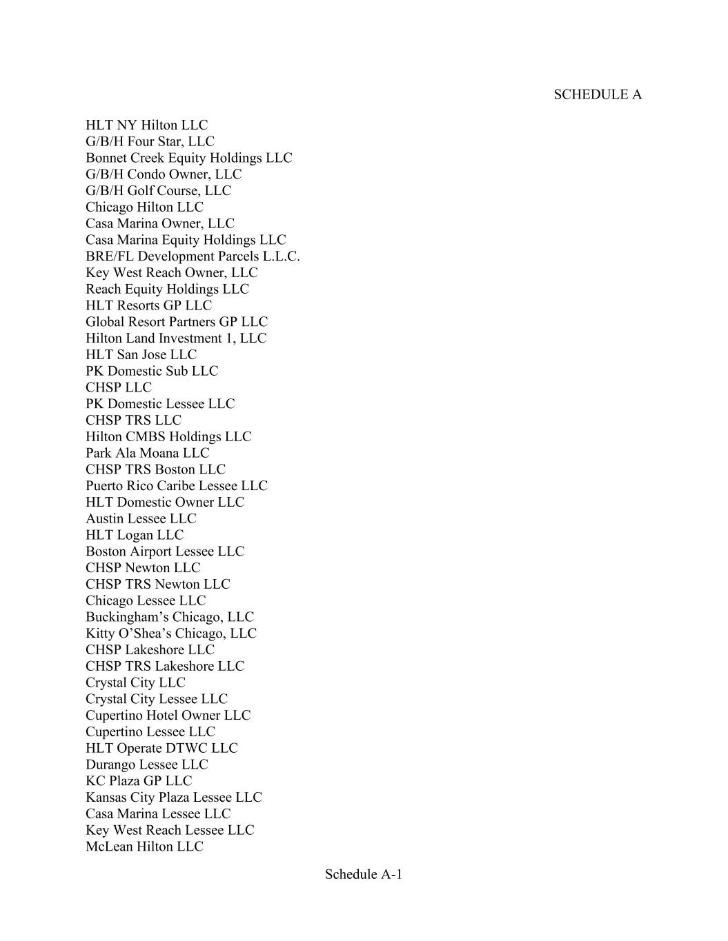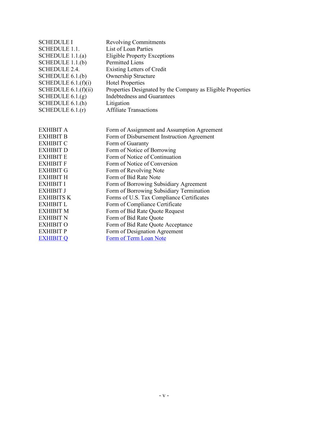 - v - SCHEDULE I Revolving Commitments SCHEDULE 1.1. List of Loan Parties SCHEDULE 1.1.(a) Eligible Property Exceptions SCHEDULE 1.1.(b) Permitted Liens SCHEDULE 2.4. Existing Letters of Credit SCHEDULE 6.1.(b) Ownership Structure SCHEDULE 6.1.(f)(i) Hotel Properties SCHEDULE 6.1.(f)(ii) Properties Designated by the Company as Eligible Properties SCHEDULE 6.1.(g) Indebtedness and Guarantees SCHEDULE 6.1.(h) Litigation SCHEDULE 6.1.(r) Affiliate Transactions EXHIBIT A Form of Assignment and Assumption Agreement EXHIBIT B Form of Disbursement Instruction Agreement EXHIBIT C Form of Guaranty EXHIBIT D Form of Notice of Borrowing EXHIBIT E Form of Notice of Continuation EXHIBIT F Form of Notice of Conversion EXHIBIT G Form of Revolving Note EXHIBIT H Form of Bid Rate Note EXHIBIT I Form of Borrowing Subsidiary Agreement EXHIBIT J Form of Borrowing Subsidiary Termination EXHIBITS K Forms of U.S. Tax Compliance Certificates EXHIBIT L Form of Compliance Certificate EXHIBIT M Form of Bid Rate Quote Request EXHIBIT N Form of Bid Rate Quote EXHIBIT O Form of Bid Rate Quote Acceptance EXHIBIT P Form of Designation Agreement EXHIBIT Q Form of Term Loan Note